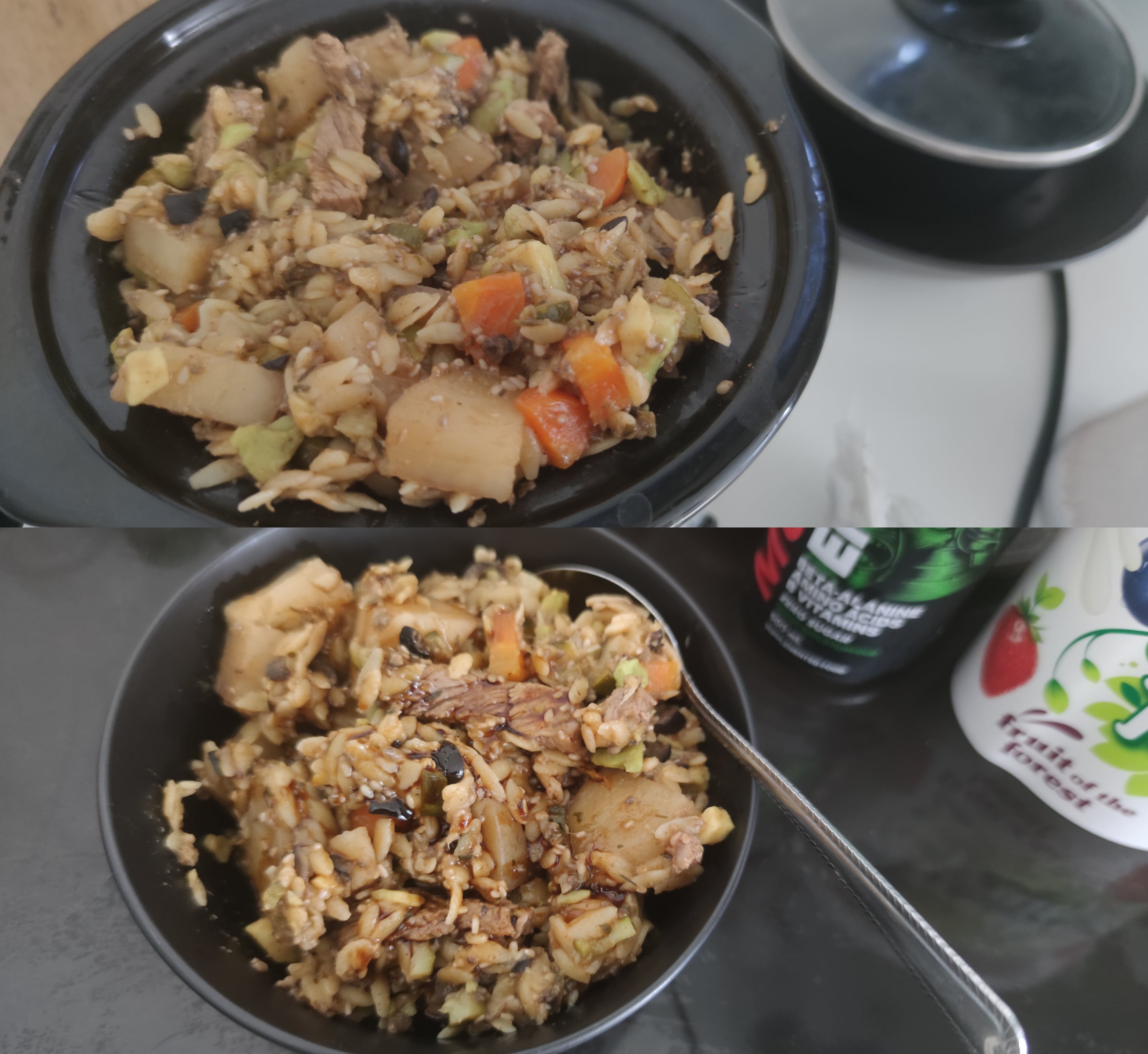 After 3 hours started addition of what I could find. A ripe avocado, 1 courgette, 100g black sliced olives, 6tsp sesame seeds, 4tsp chia seeds. 1 cup of Orzo that expanded like slow mo popcorn.