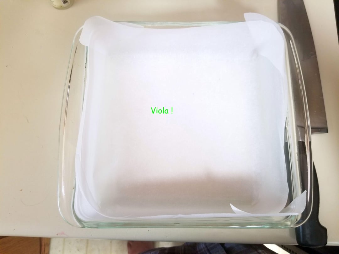 When lining square or rectangular pans with parchment or wax paper, cut the paper bigger on all sides by the depth of the pan. Then cut in at each 90-degree corner the same depth of the pan. Then press paper easily into pan for no wrinkles and a perfect fit.