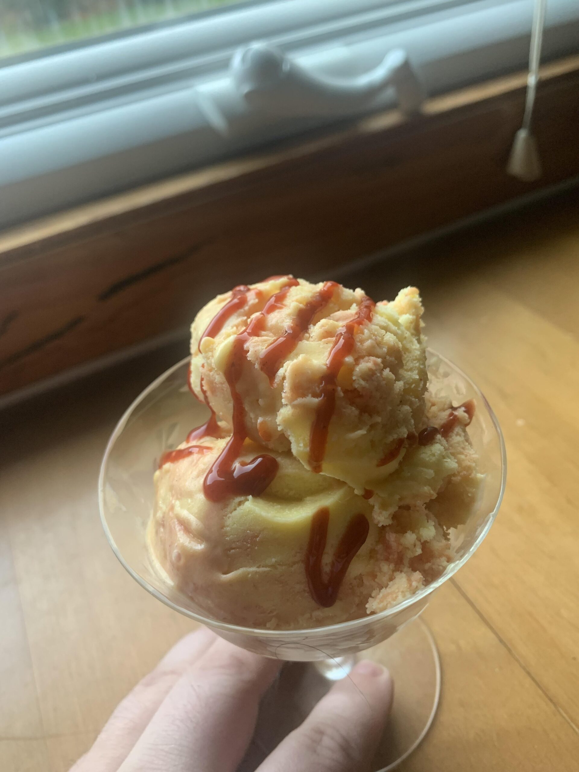 Classic French custard base – 1:1 1.5 cups whole, 1,5 cups half n half with 4 yolks, about 3/4 cup sugar whipped into yolks. I puréed the mango into the milk mixture then simmered and tempered in eggs. Chamoy reduction was very tangy. Came out a bit icier than l wanted but likely because of the amount of fruit in it. Overall pretty good!