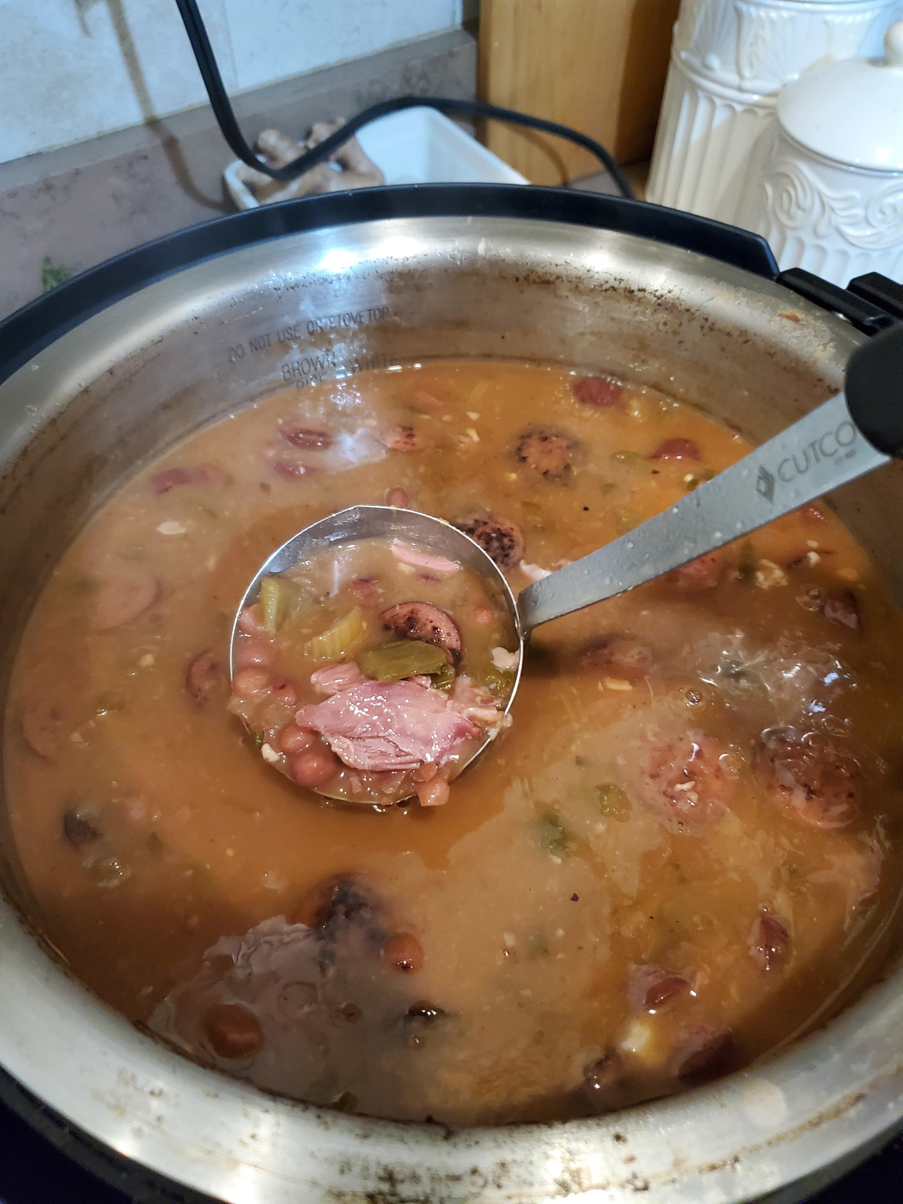 Small red beans soaked overnight Browned smoked sausage Trinity plus garlic until translucent 1tbs cider vinegar 1tsp creole seasoning 3 bay leafs 1/2 tsp died thyme, paprika and garlic powder Handful of chopped parsley Salt and pepper 2 smoked ham hocks Water to cover 4-6 hrs