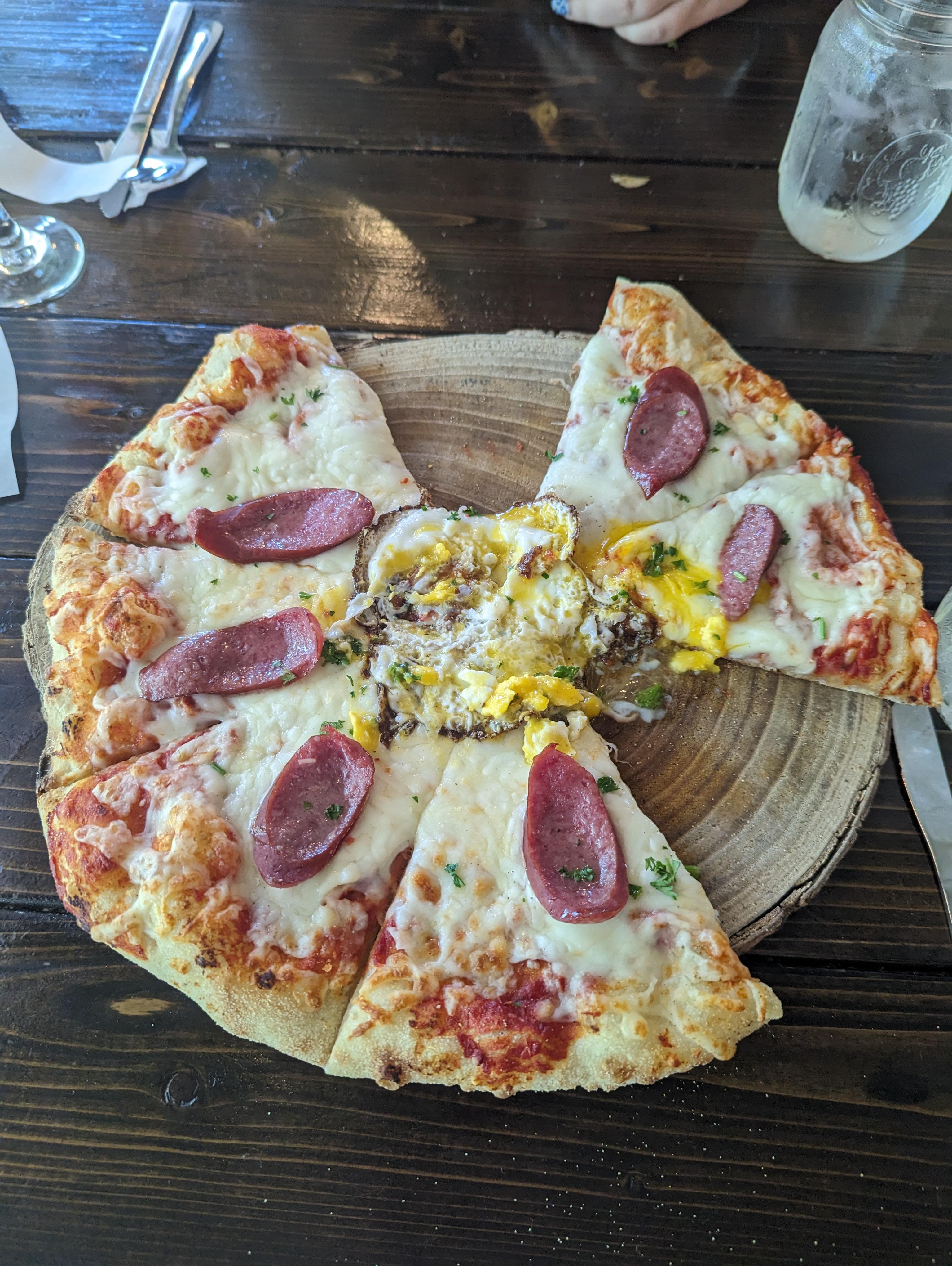 The wood wasn’t even treated. It was a full pizza on something that came directly from the tree. No side plates given.