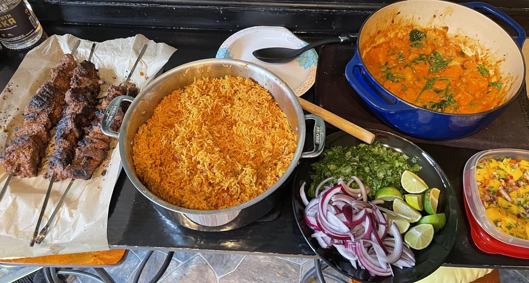 What’s that condiment/salad on the bottom left? What meat are the kabobs?