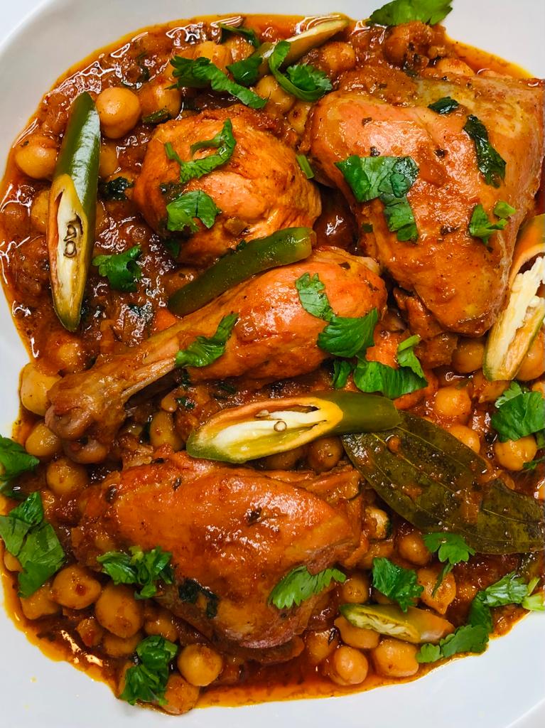 Heat Oil in a wok and add chopped Garlic, Bay Leaves & Cinnamon, Sauté for a minute. Add chopped Onions and sauté for 3-4 minutes. Add Tomato Puree, Chili & Turmeric Powder, Garam Masala, Curry Powder, Cumin & Coriander Powder. Add Salt and mix it well. Cover and simmer for 5 minutes. Add Yoghurt and simmer for another 5 minutes. Add Chicken pieces to the gravy and mix it well. Cover and cook Chicken for 15 minutes. Add cooked Chickpeas, Kasoori Methi and mix it gently. Cover and simmer for 2 minutes and add chopped Green Chillies & Fresh Coriander. Cover and simmer for 2 minutes. Chicken Chickpea Curry is now ready. Serve it with Naan or Steamed Rice…Enjoy 😋