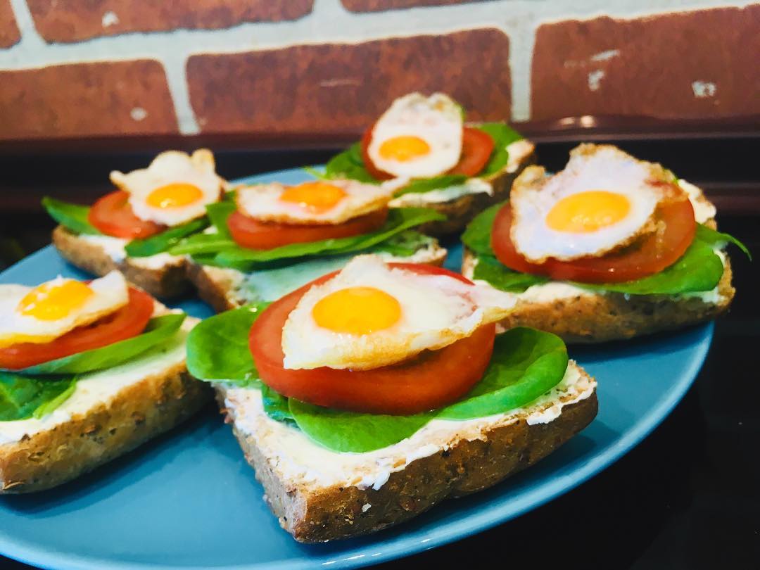 emimur 2 years ago Ingredients:βοΈ Whole-grain bread with cerealβοΈ Cottage cheeseβοΈ SpinachβοΈ TomatoβοΈ Quail eggs​Preparation:π€Grease the bread with cheese curdsπ€ Lay spinach leaves on itπ€Cut tomato into thin slices, place on spinach, salt.π€Fry quail eggs on a/p pan, salt, place on tomato.​Enjoy!!! π