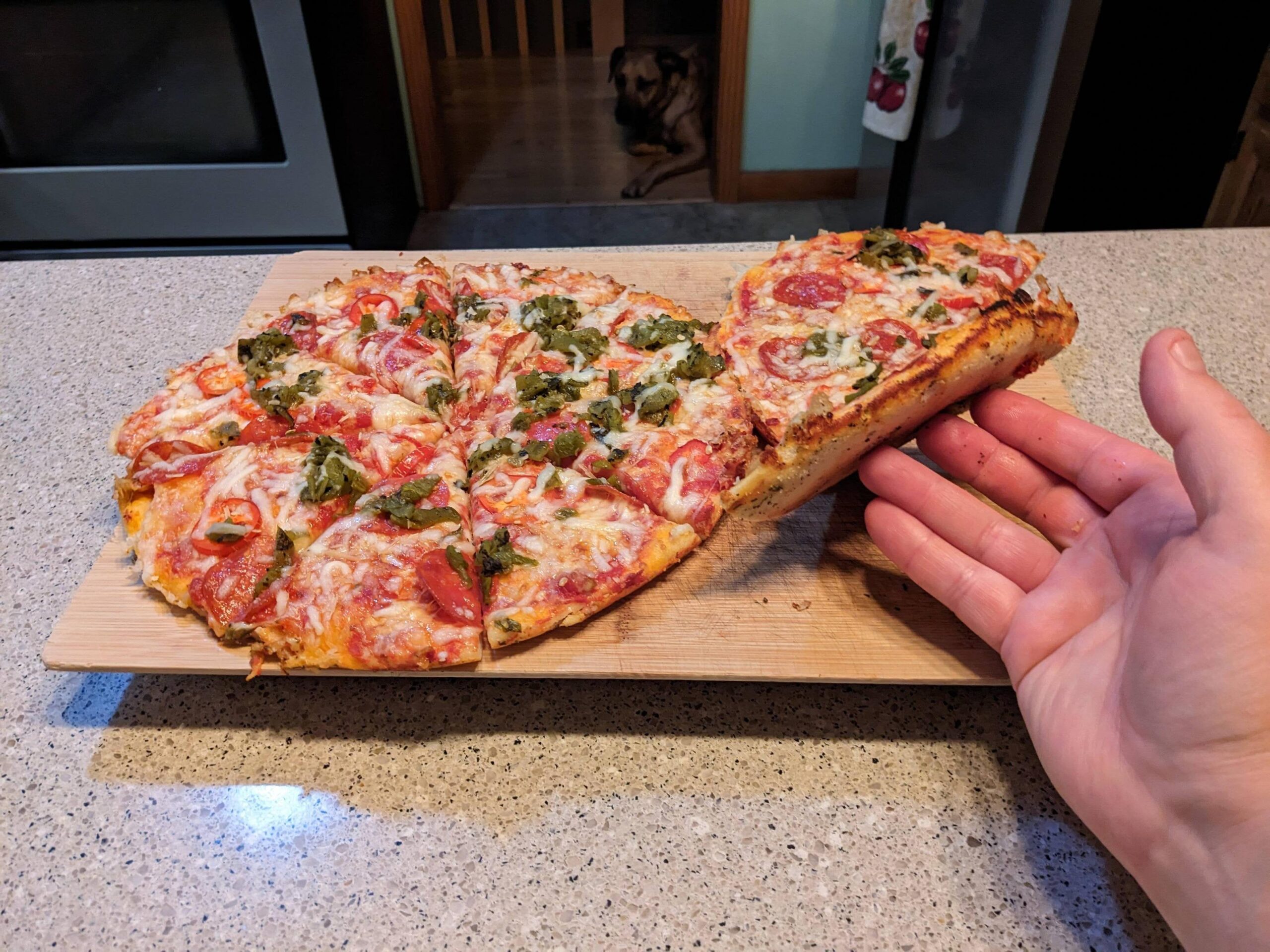 00 Flour, apid yeast, ‘raw’ crushed tomato sauce, ripened jalapeños from our garden, roasted/peeled/diced hot hatch chilies. 8 minutes on medium burner, topped, then finished in the oven on top rack with broil on high. Just enough burn, no hot sauce required.