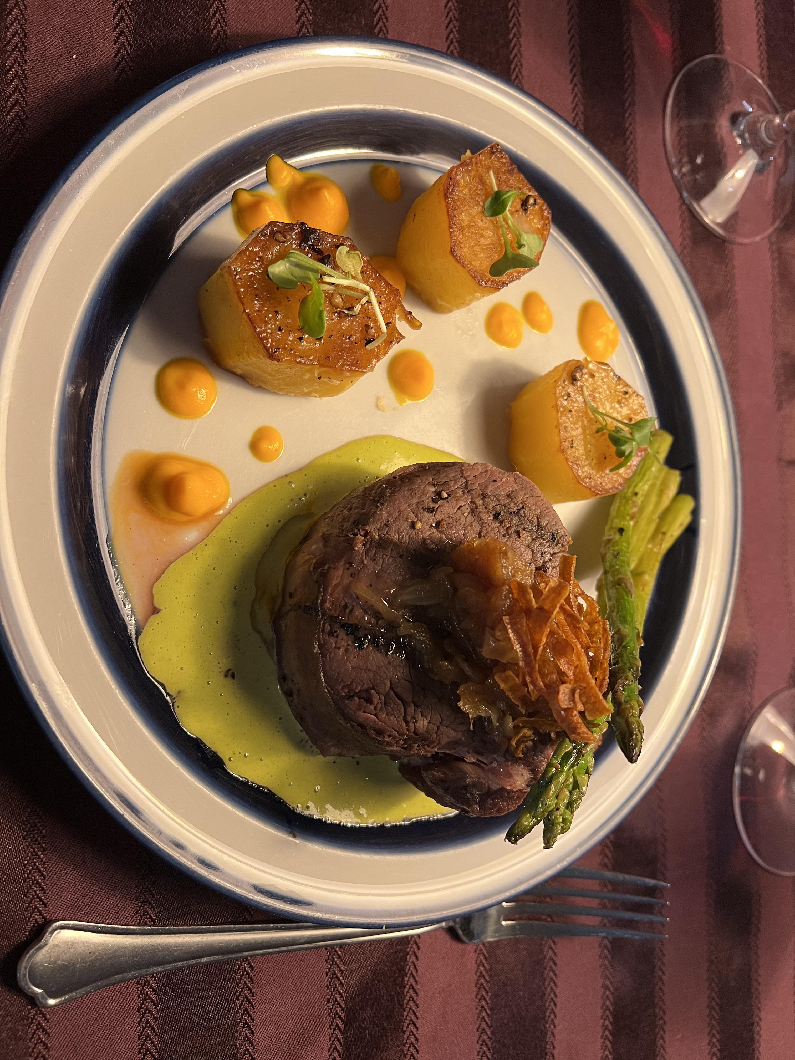The asparagus should be flat on the plate, I’m not a fan of the asparagus lean-to. The potatoes should be closer together. Three potatoes and some puree are taking up almost half the real estate of the plate. While I’m interested in the green shaded sauce it does appear to be very thin for a bearnaise. I’m sure you’re aware of the steak juice so we don’t have to talk about it. Otherwise its not terrible. I would definitely eat this. Just tighten it up a bit.