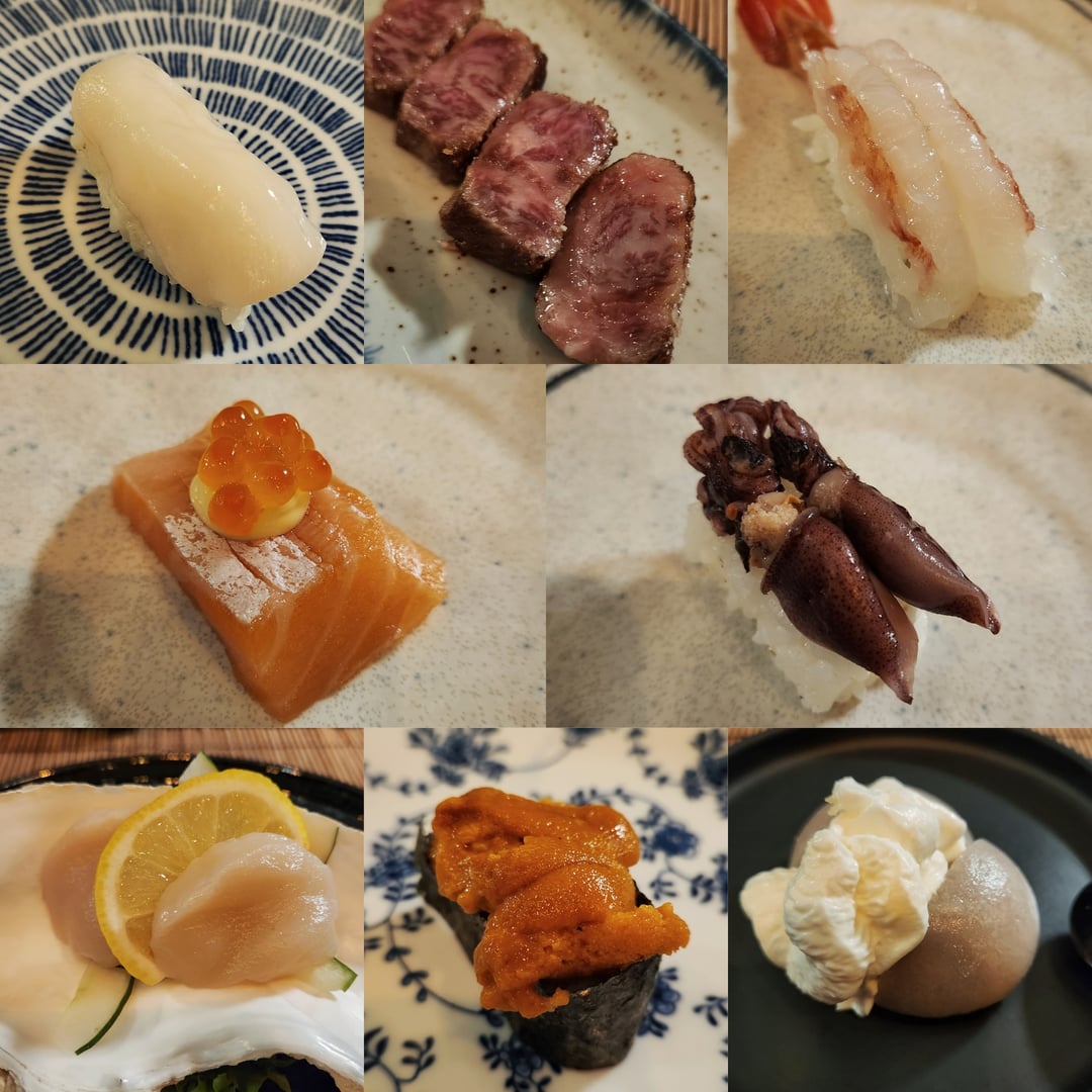 Octopus (tako), wagyu beef, large shrimp (amaebi), king salmon (sake), squid (hotaru ika), Hokkaido scallop (hotate), Hokkaido sea urchin (uni) and finally a red bean mochi for dessert.