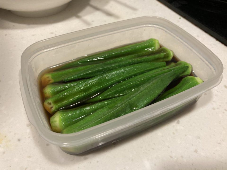 * Okra: trim the woody tops off, and rub them with some salt after washing. * Ice bath: technically optional, but important for keeping the vegetables bright green and crisp. * Marinade: Dashi and soy sauce, diluted to taste with water. I sweeten it with mirin, but plain sugar also works.