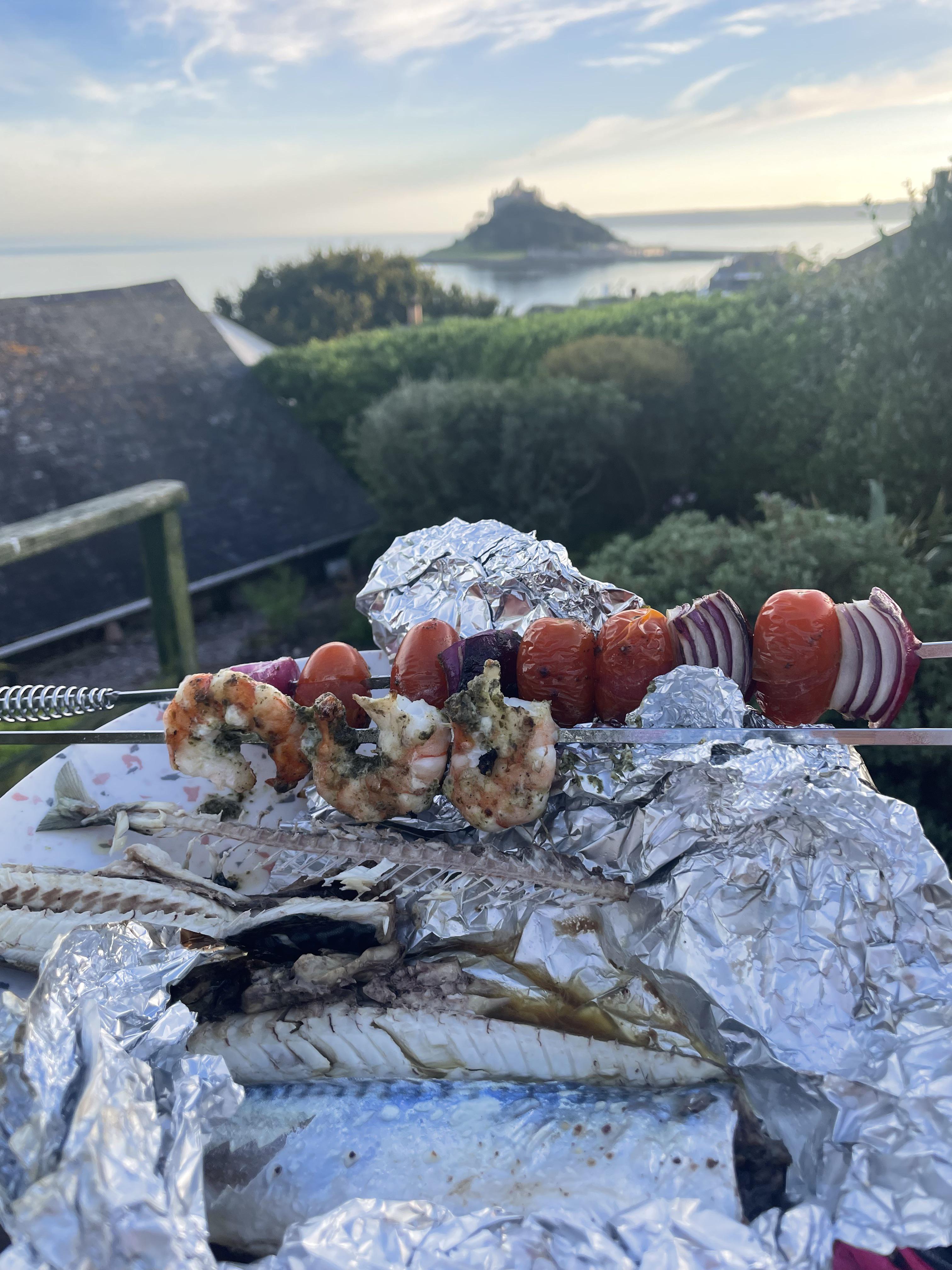 Paired with tiger prawns and veggy skewers, eaten outside overlooking St Michael’s Mount last night.