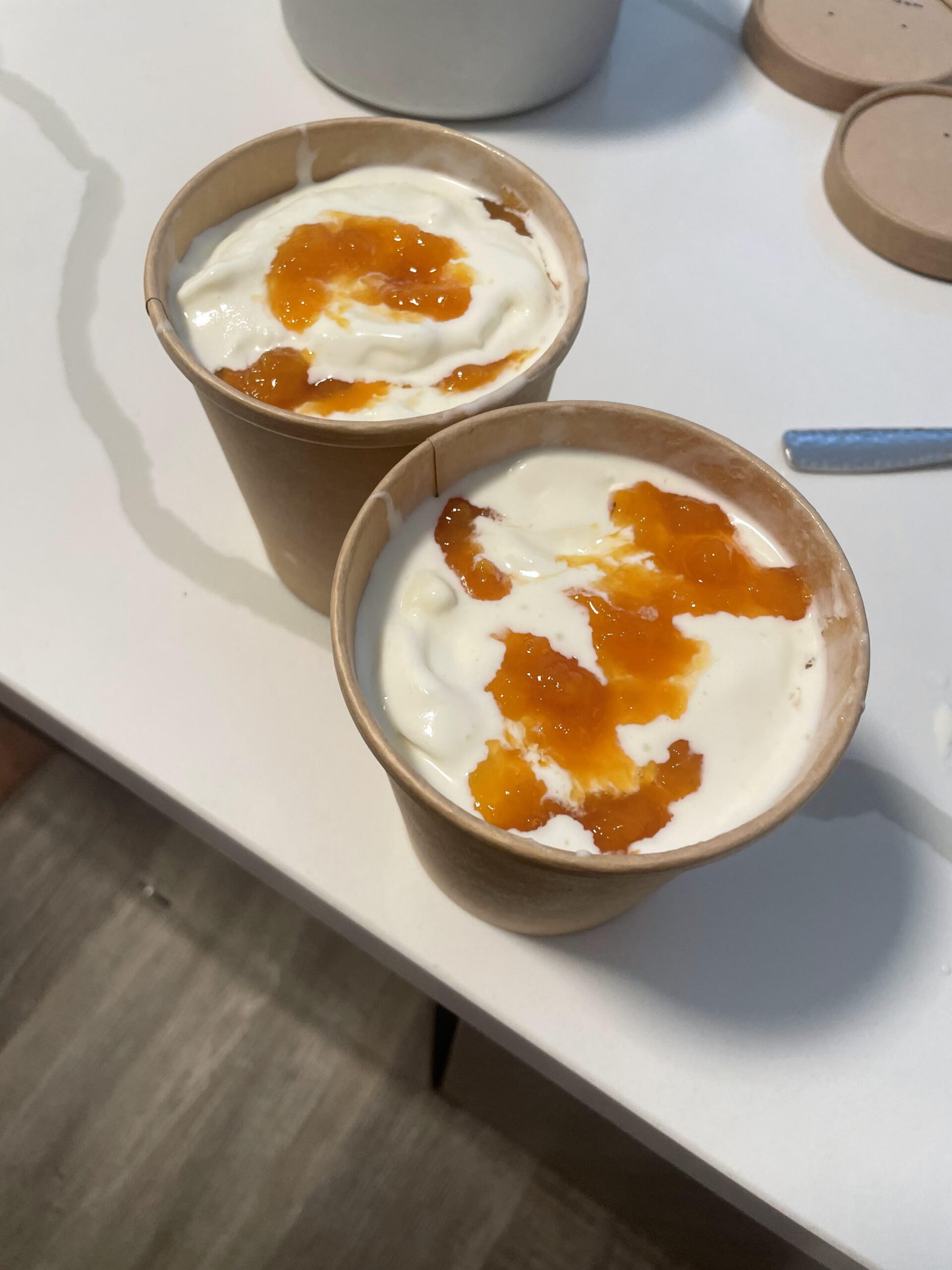 Afterwards I strained the mixture out, pressing the croissant pieces to get as much base out of them as possible and churned. Finally I packed it while layering in some homemade peach jam.