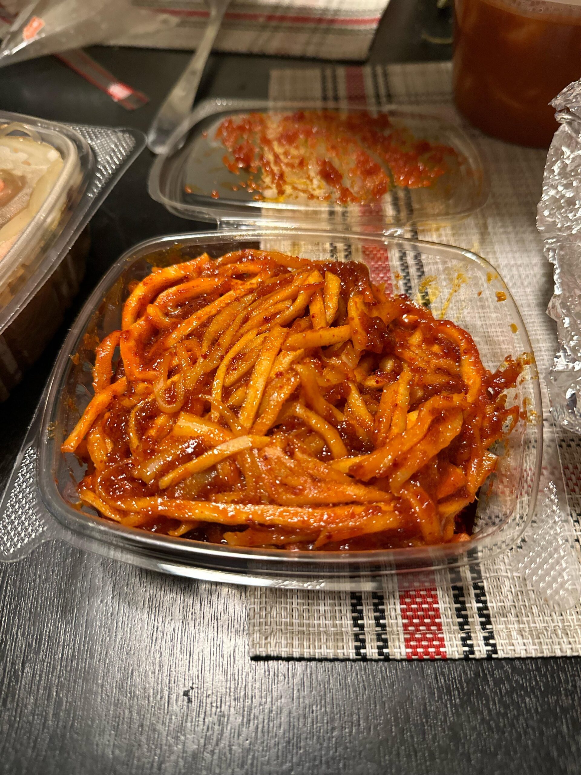 What is this? by D3ltaforce_ 2 Comments artcostanza82 3 years ago Dried squid probably. If not, daikon slaw kuil09 3 years ago if you taste bitter, it must be “도라지 무침(doraji moochim)”Write A CommentYou must be logged in to post a comment.