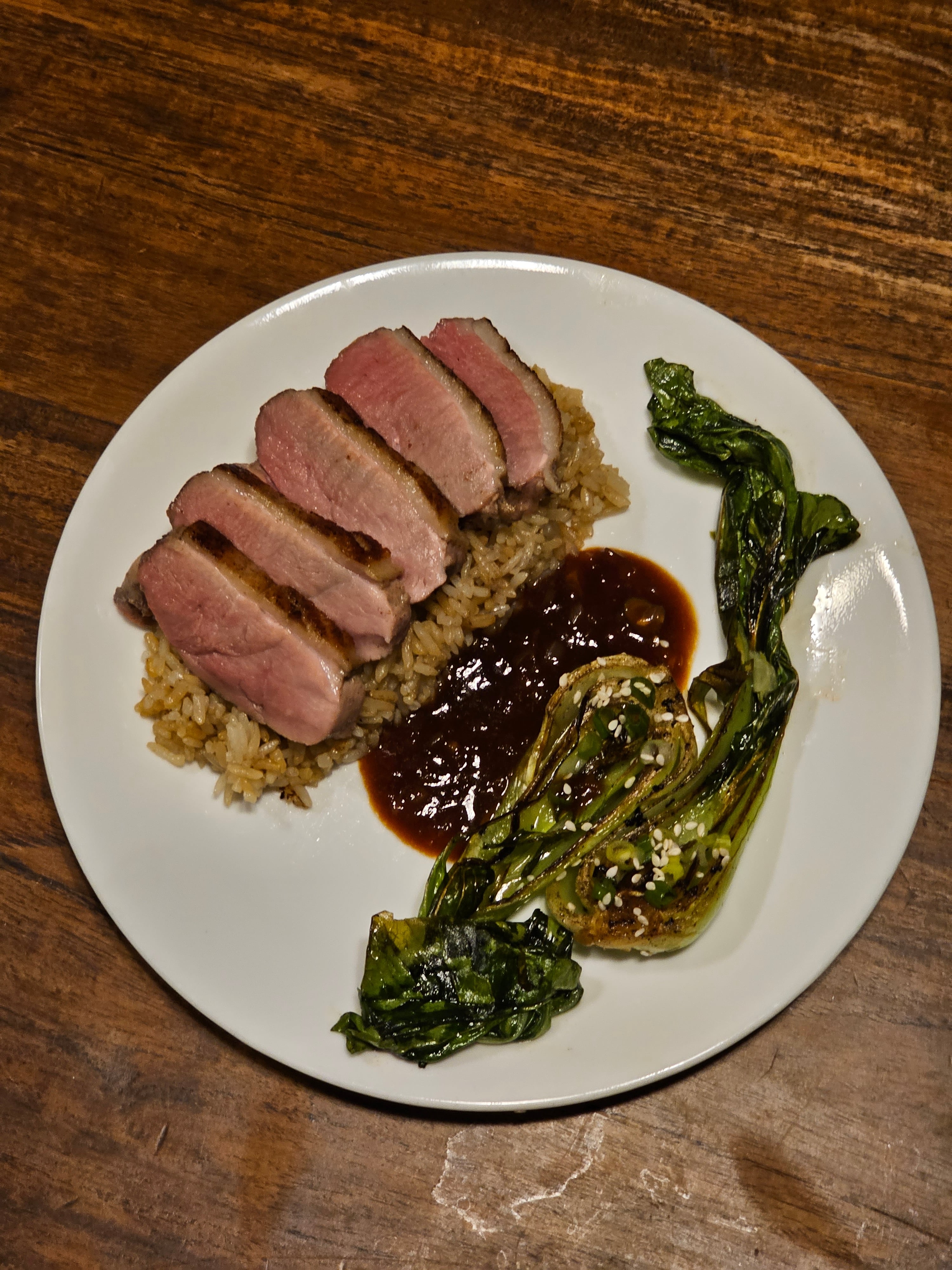 Shio Koji duck breast, seared bok Choy, duck fat fried rice and mandarin hoisin sauce
