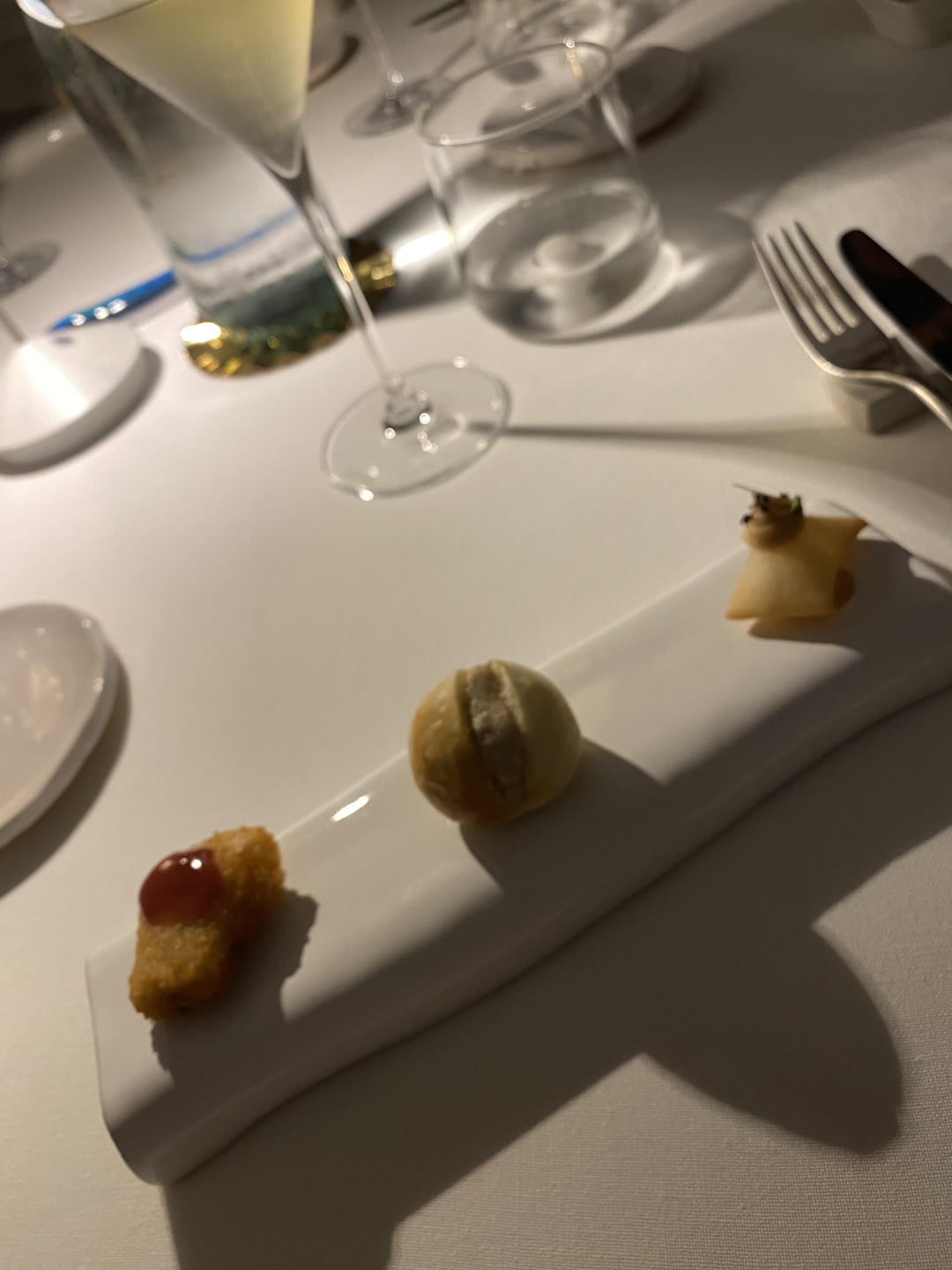 1. Right to left – fried gnocchi with squid, bread with merluzzo mouse, fried fish with sweet onion.