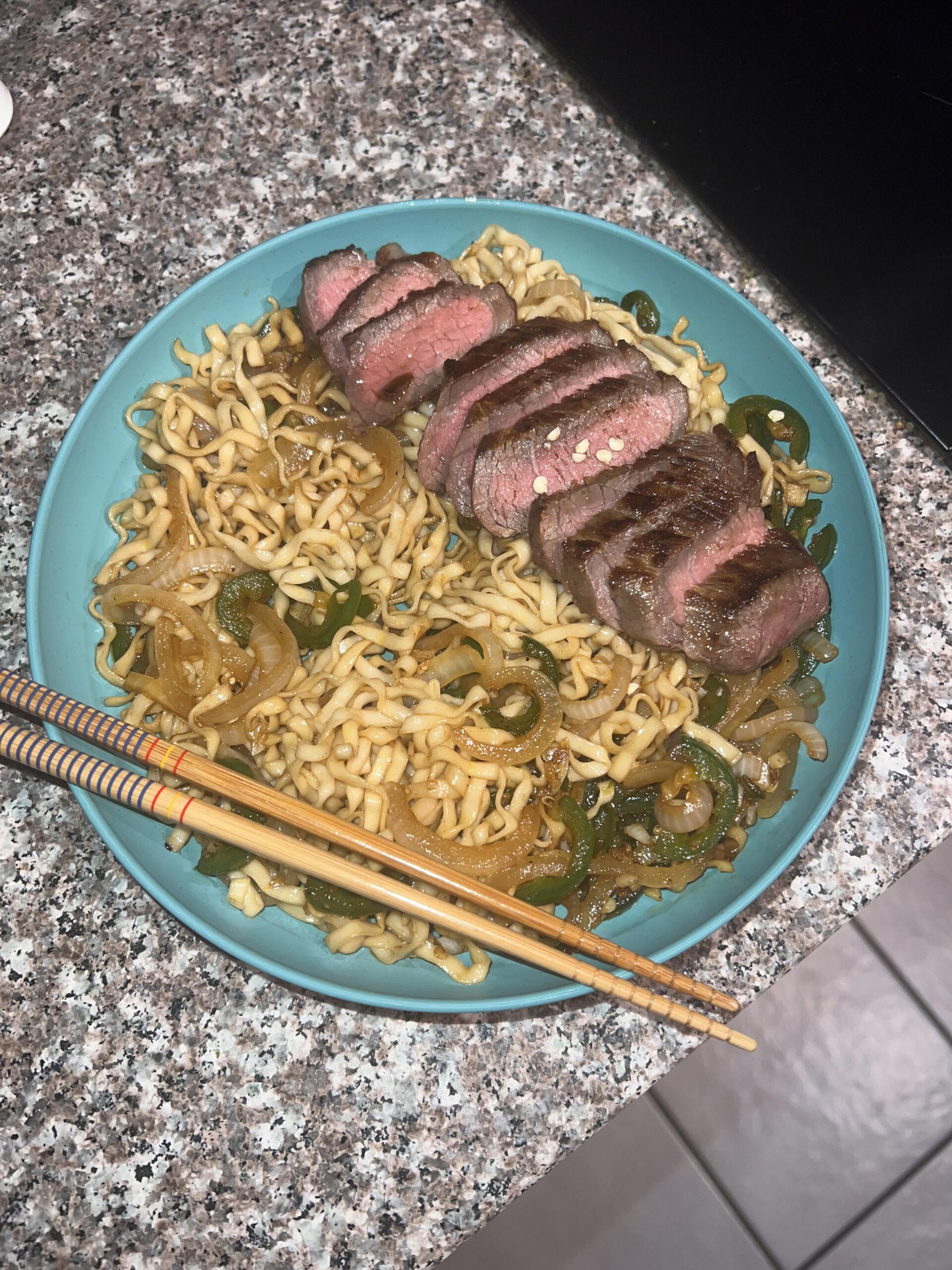 Boiled up some Momofuku Spicy Soy Noodles. Then I seared a picanha steak that I seasoned with just salt. Left that on the side to rest and then added 1/2 an onion sliced and 2 jalapeños. Once they were mostly cooked I added 4 chopped cloves of garlic (I really like garlic). Once that became fragrant, I added the spicy soy packet that came with the noodles. Then I added the noodles to the rest of the ingredients. Stir fried them till I was happy with how they looked and plated them. Sliced the steak up and put it on top of the noodles.