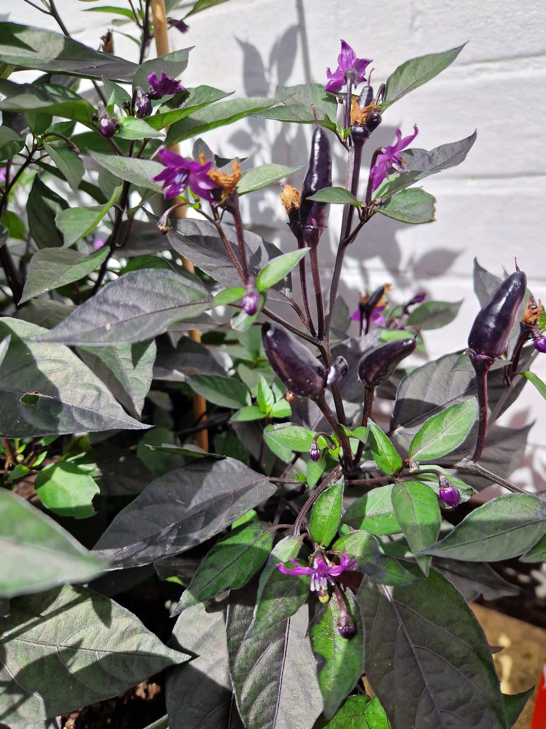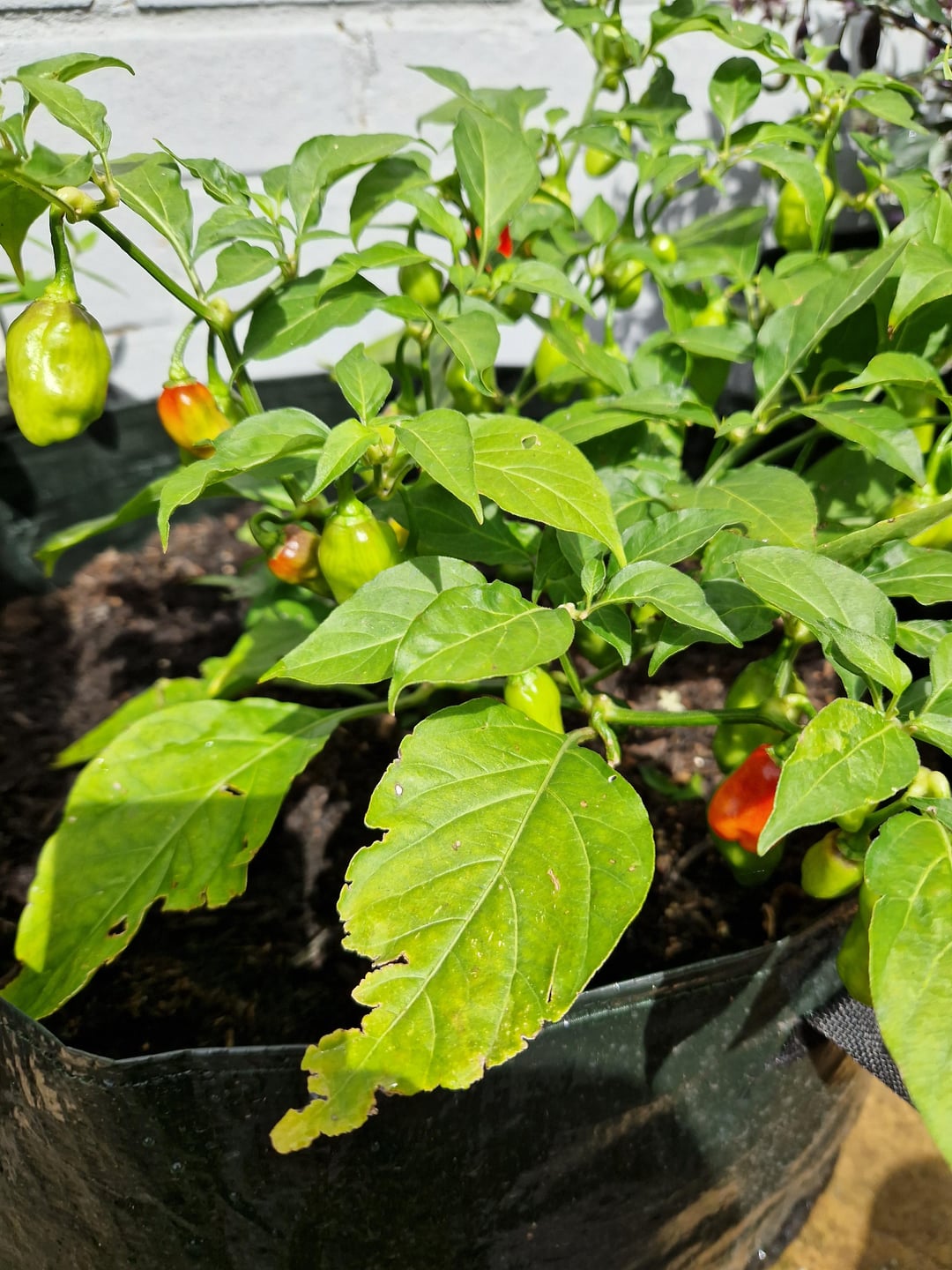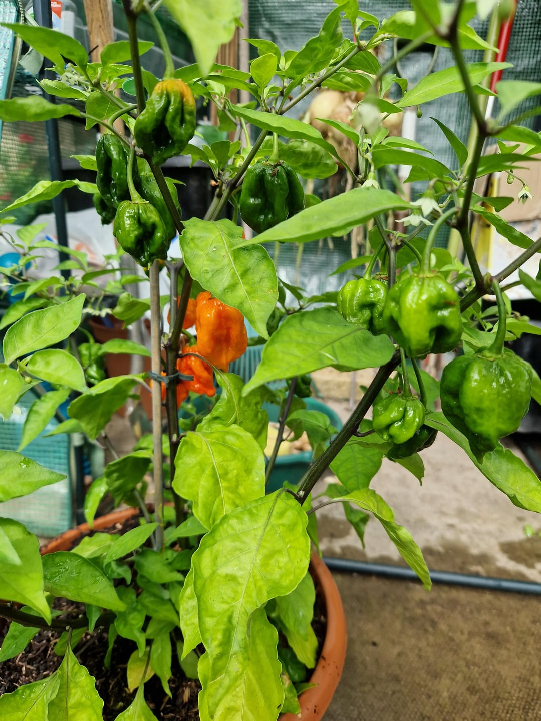 From left to right: Hungarian hot wax, Peach Reaper, Buena Mulata, Scotch Bonnet, Jigsaw pepper, last two are both Royal Black