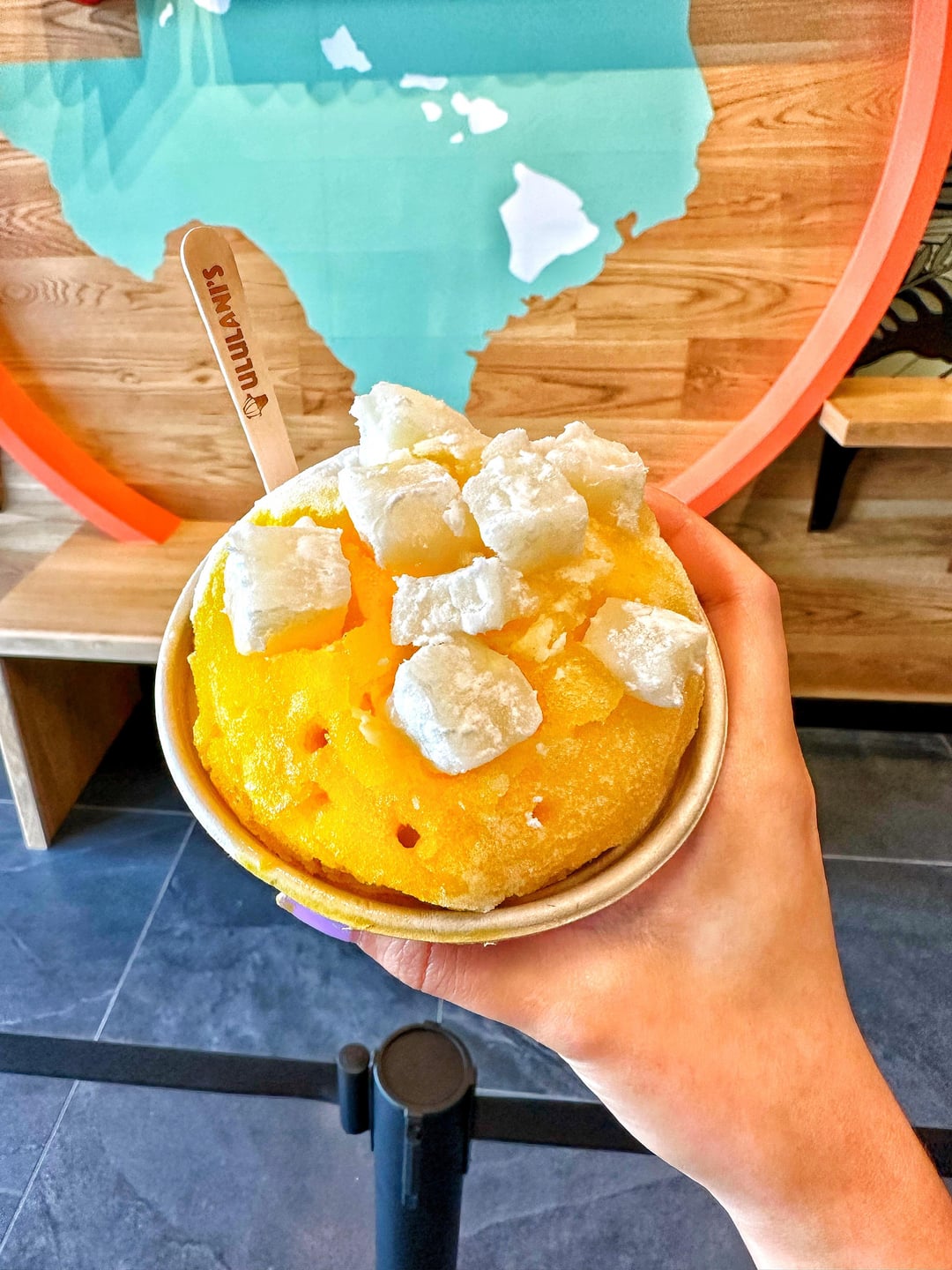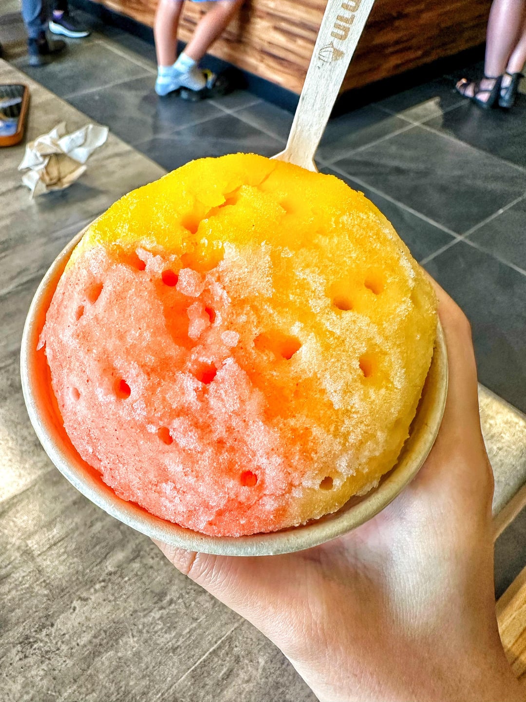 We got the No Ka Oi (passion fruit, mango, coconut) with a snow cap (sweetened condense milk topper) and the mochi, and a sunset beach (passion orange, mango, guava) with ube ice cream. They tell you that if you want more syrup you can come back to the front of the line and get it topped off—we found the syrup/ice ratio was perfect as-is but it’s nice to know.