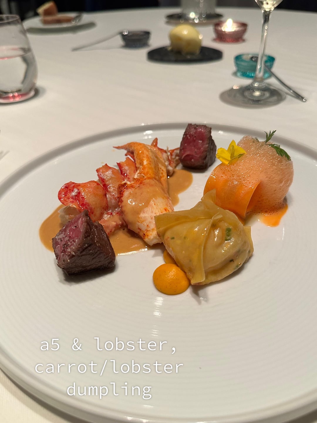 \-protein dishes were the favorites, everything was cooked exceptionally. Loved the wagyu and lobster, but there was so much lobster (tail and claw) with two small (insanely good) pieces of a5. Didn’t love the carrot/lobster dumplings or accompanying foam/puree.