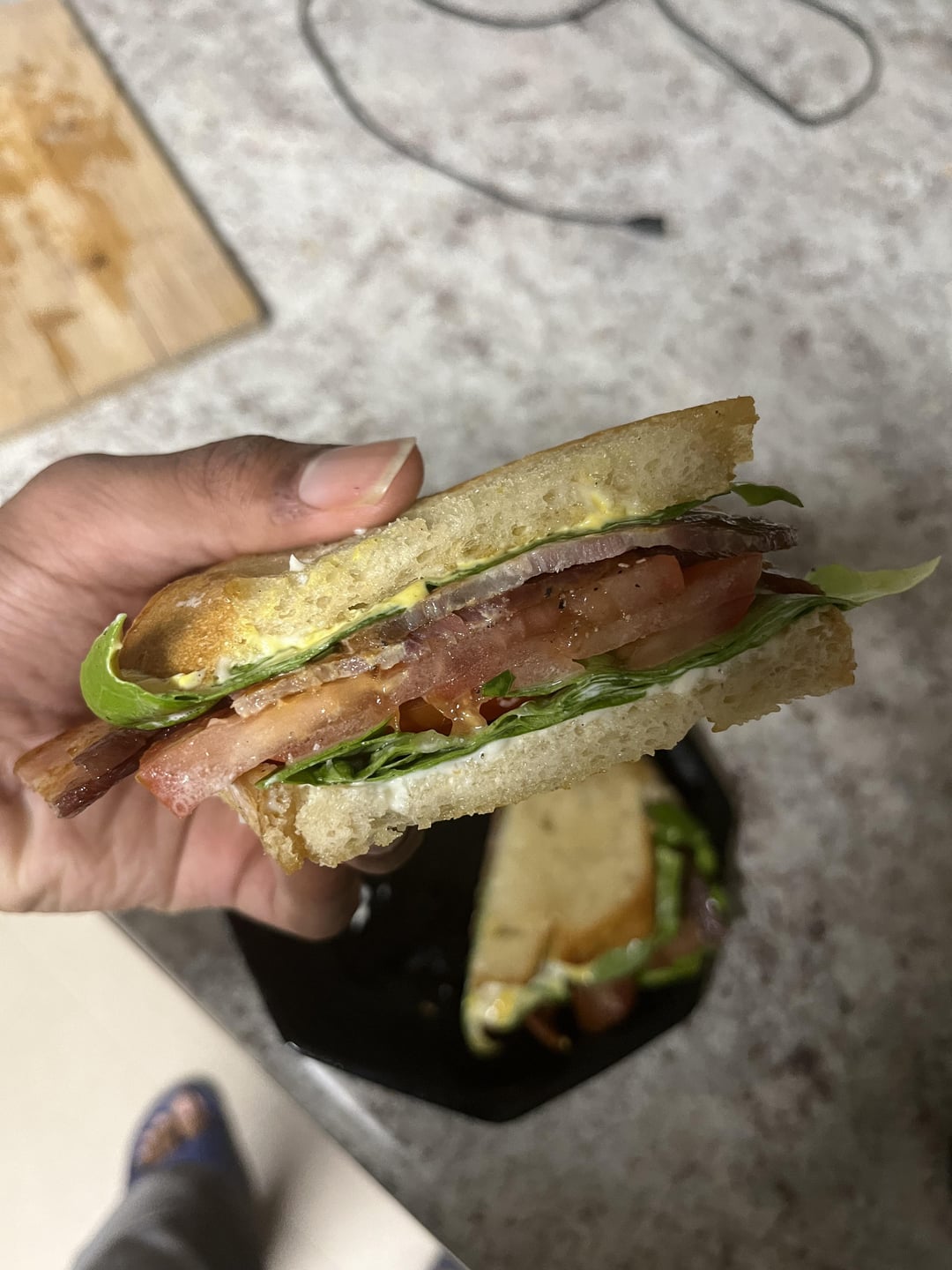 Thick cut bacon, butter lettuce, classic tomato, mayo, and mustard on sourdough. Also was my first time trying sourdough, and I love it.by rw105 1 Comment dudly825 2 years ago Looks delicious! Eat it already.Write A CommentYou must be logged in to post a comment.