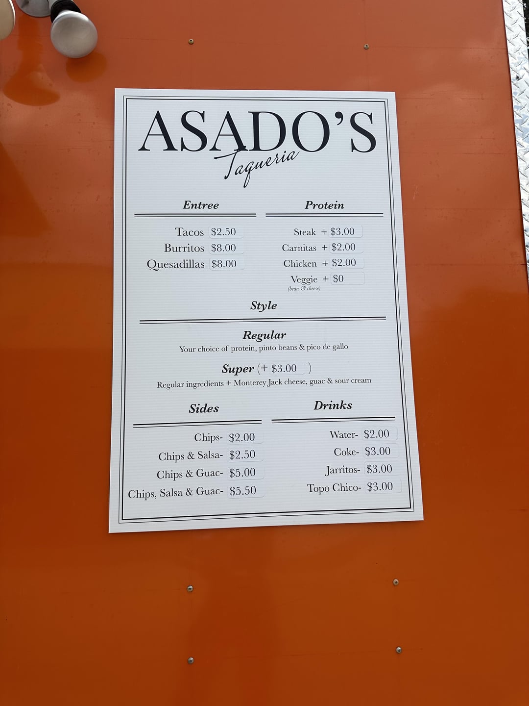 I went to try Asados Taqueria! They were closed for 3 years and the owner used to have a shop inside of springdale. They have since reopened doing cali mex and mission style burritos! I got the steak burrito super style for 14 and asked for it to be crispy. and the quesadilla with carnitas for 10. I ate one of the quesadilla pieces in the photo but it comes with 4! Man it was so delicious, I think this is the best cali mex i’ve had in Austin ever. Menu is attached at the very end !