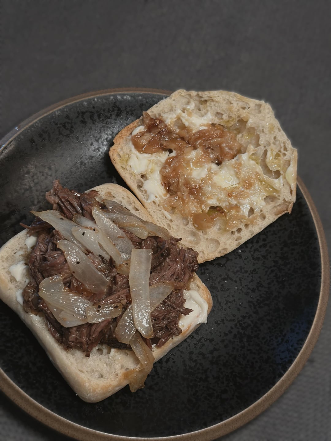 Decided to class up the ‘ol Mississippi pot roast and make sandwiches with it. Made it on Ciabatta bread with homemade garlic confit, arugula, and a slice of havarti cheese.