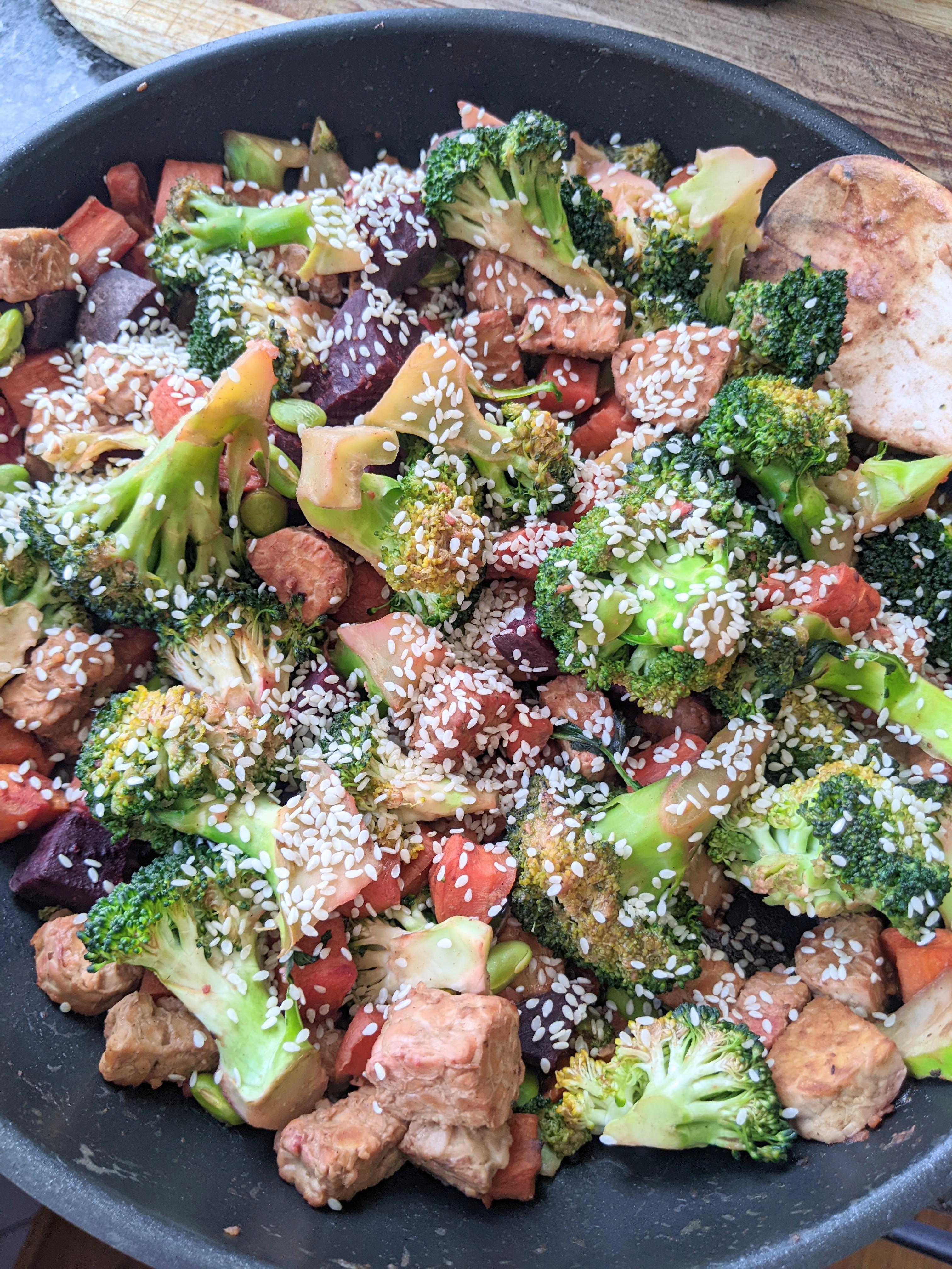 A quick tempeh stir-fry for lunch. I had the stir-fry sauce already made in the fridge which made it quicker. I added edamame and nutritional yeast to increase the protein.