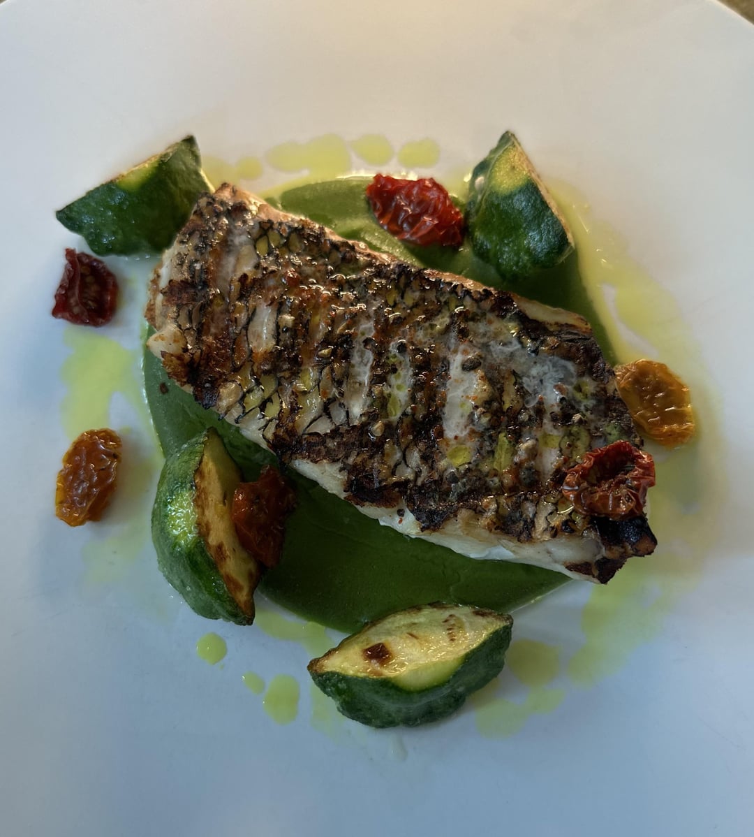 2. Montauk bass, zucchini, lemongrass foam, roasted peppers, zucchini puree