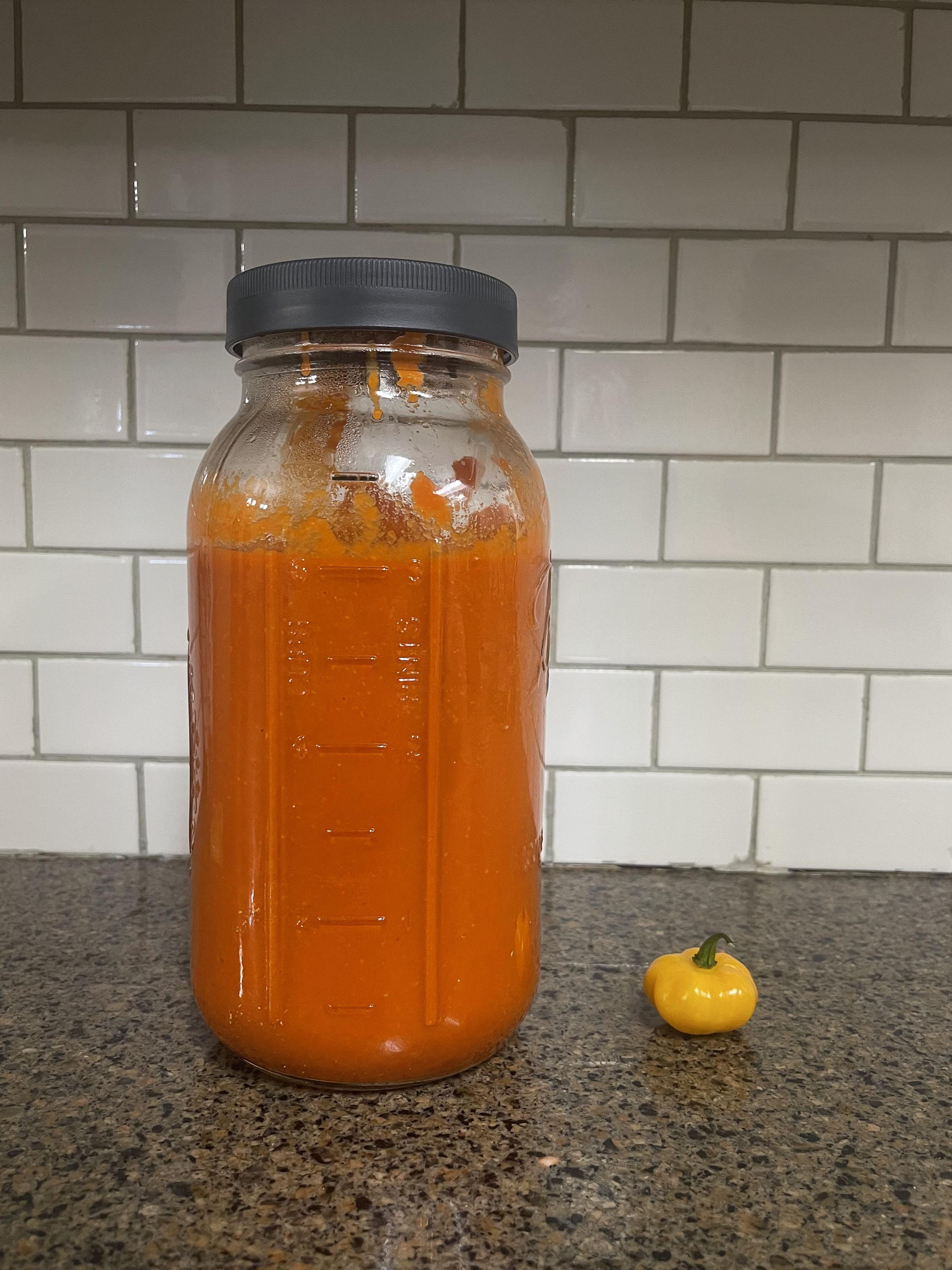 Three pints of puréed, fermented reaper/ghost mash w/garlic. Honestly tastes amazing as is…although potent would be a drastic understatement.