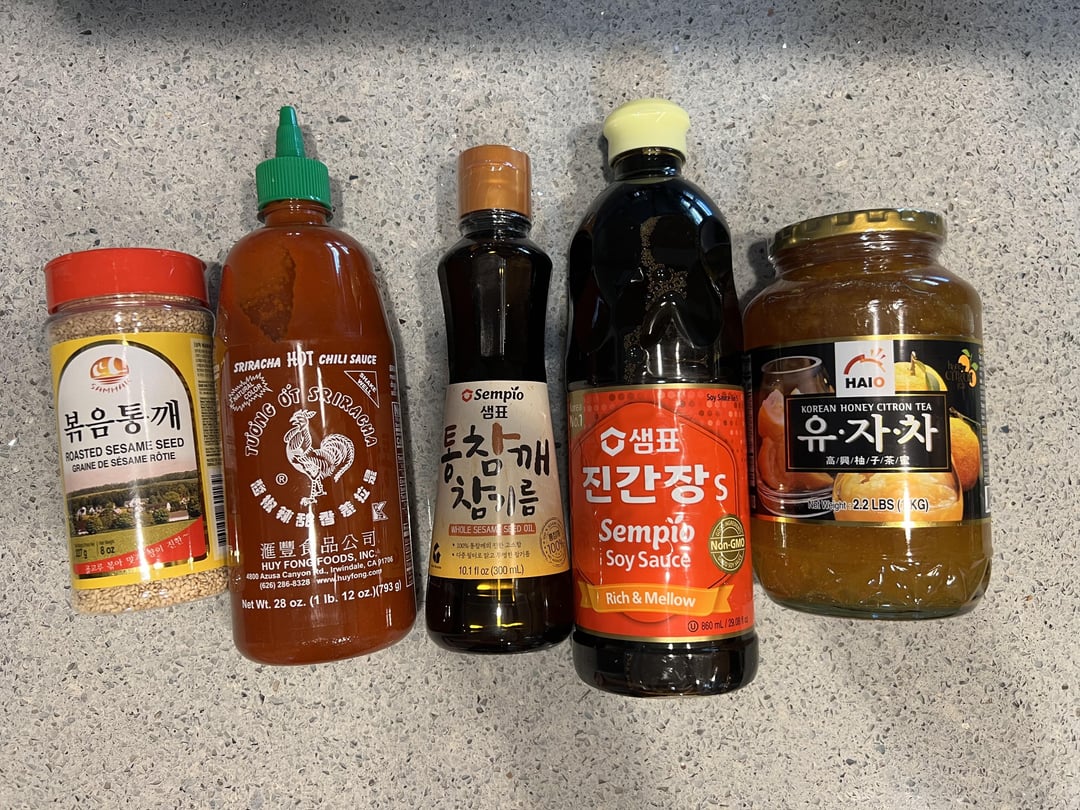 Photo 3: kitchen essentials. Sesame seeds, sriracha, sesame oil, soy sauce, honey citron tea (what is the deal with 4/5 cup of water for this tea lol)