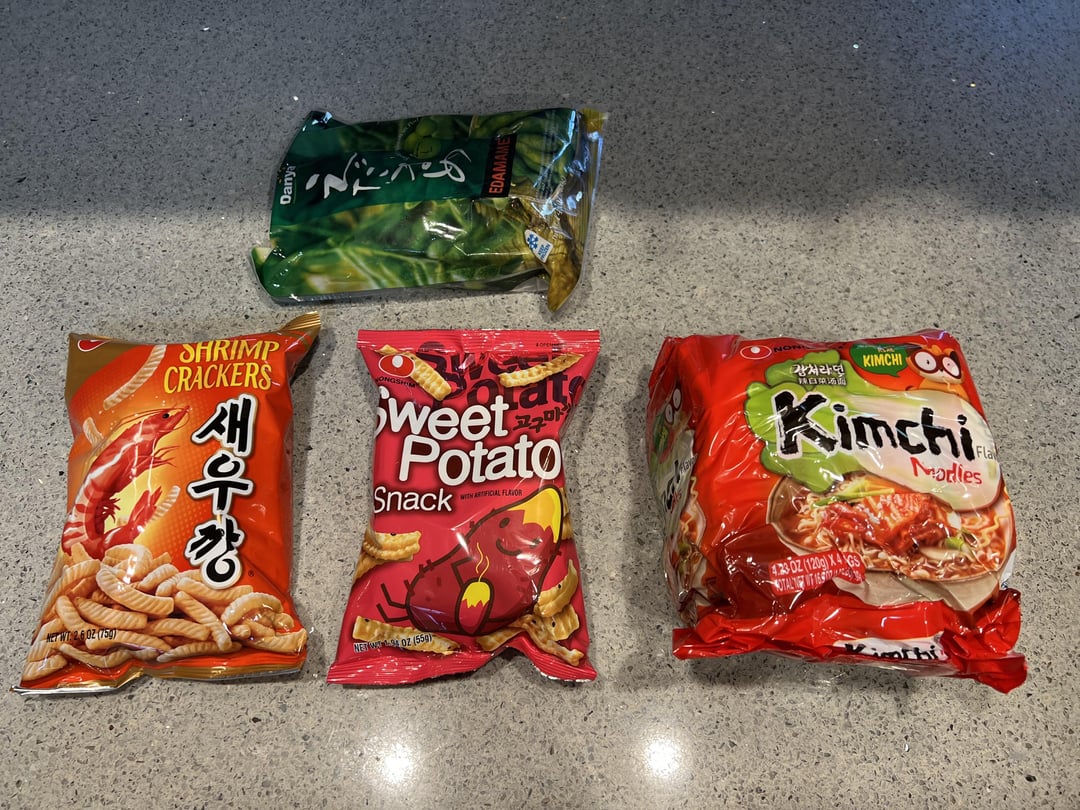 Photo 4: snacks. Obligatory shrimp chips, sweet potato snacks, roulette noodles for my brother. Edamame that is frozen and snuck into this photo