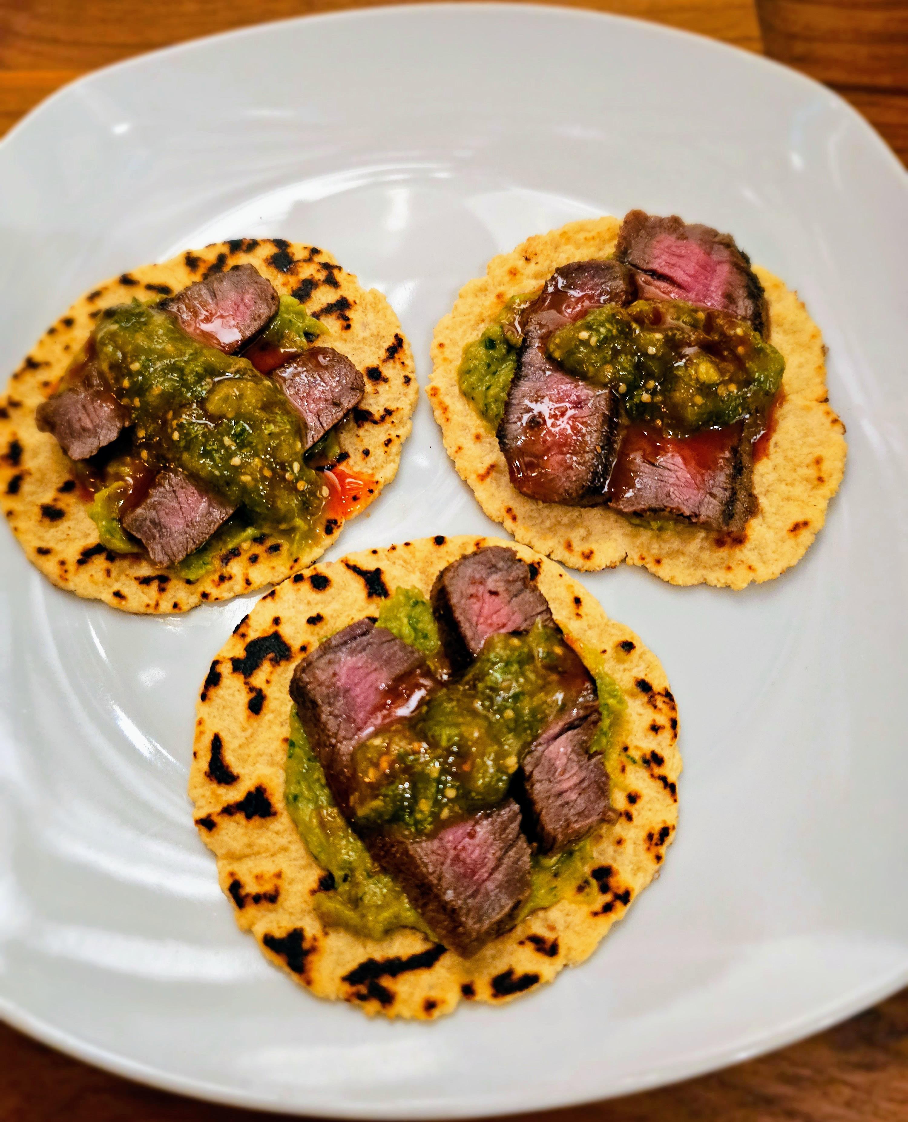 Salsa Verde – about 12 tomatillos, 1/2 cup chopped white onion, 2 cloves (or more) garlic, 1/2 cup chopped cilantro leaves and stems, 1 tablespoon fresh lime juice, 2 jalapeños, and salt to taste. Broil tomatillos, garlic and jalapeños 5-7 minutes. Combine all ingredients in a blender or food processor and blend until you reach a smooth consistency. Chill for at least 2 hours.