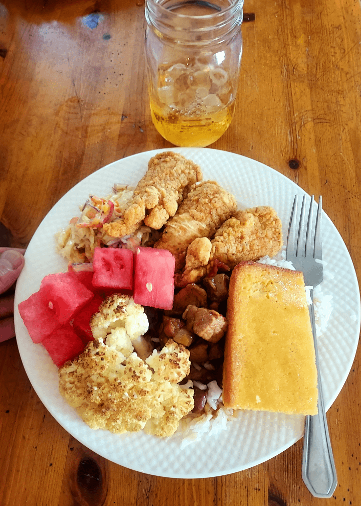 [I Made, Homemade] Fried Catfish, Pork Green Chili & Basmati Rice, Agave Butter Cornbread, Broiled Cauliflower, Watermelon, Spicy Coleslaw, Black Label Jamisonby ChefSunShine Write A CommentYou must be logged in to post a comment.