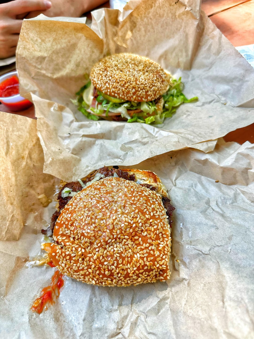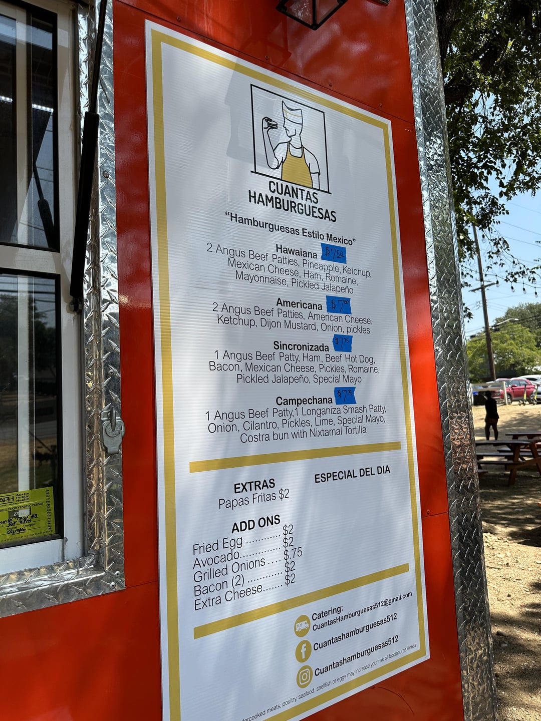Just went to Cuantas Hamburguesas. It was a saturday right at opening time and there wasn’t a line. This is the new burger truck by Cuantos. We got the americana burger for 7 bucks which comes with a double patty, and the Sincronizada one which comes with a patty, hot dog, bacon, and ham for 7.75. Also a side of fries for 2 dollars. The burgers here are great. It reminds me of Bad Larry’s, it’s a perfectly ooey gooey burger and flavorful. seasoned perfectly. loved the sesame bun. I do prefer the Americana one. The fries weren’t the best, and i hoped they would be crispier but at 9 dollars for burger and fries i’m not complaining. The entire meal before tip was only 16 dollars for 2 burgers and a side of fries. I would put this in my top burgers of Austin tier.