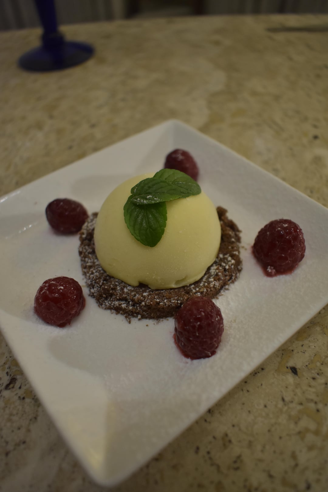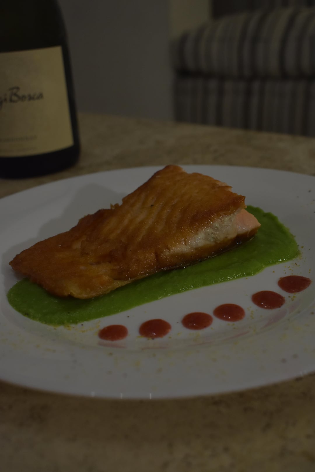Starting to plate my dishes ( salmon on pea puré with mint and Raspberry sauce. 2° slide is a with chocolate namelaka with a rasberry interior on a chocolate crumble