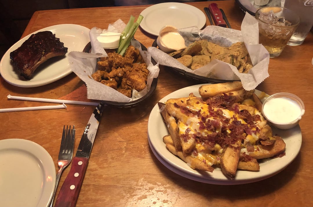 Appetizers: fried pickles, hot boneless wings, ribs, bacon cheese fries