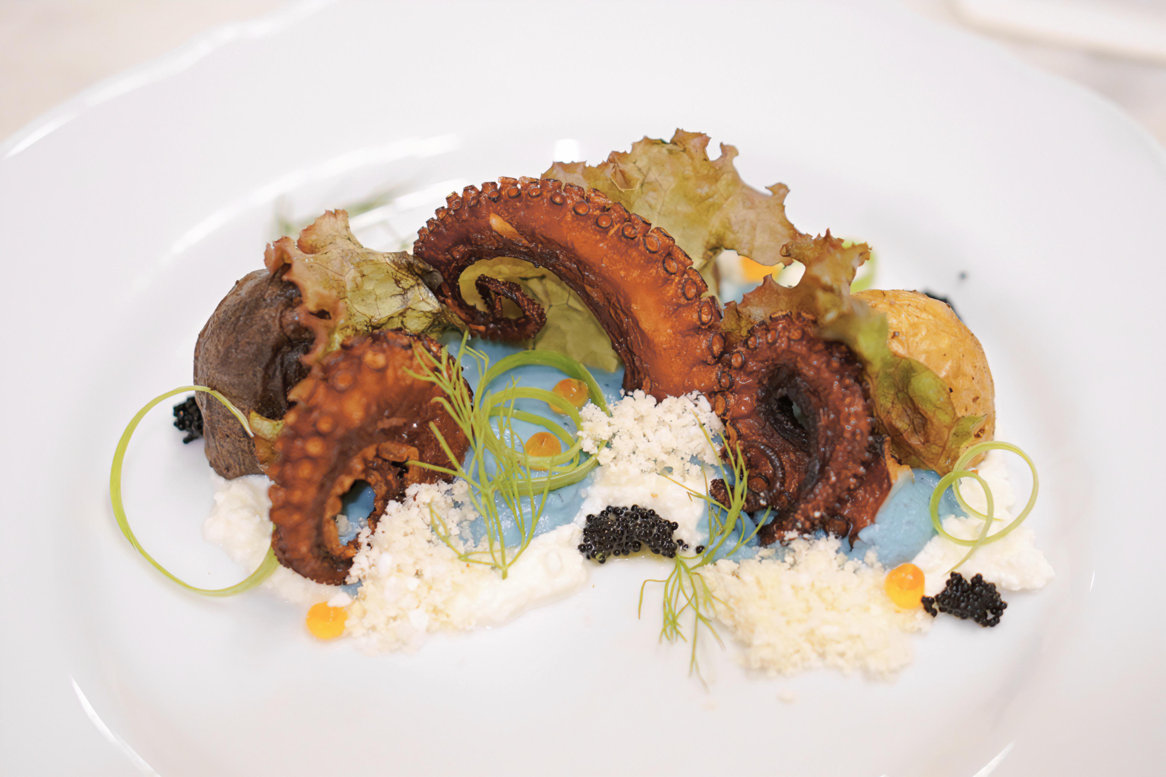 Fried Octopus and Potatoes over Blueberry Okara Sauce, Ricotta Cheese, Fish Eggs and Rice Cracker Crumble