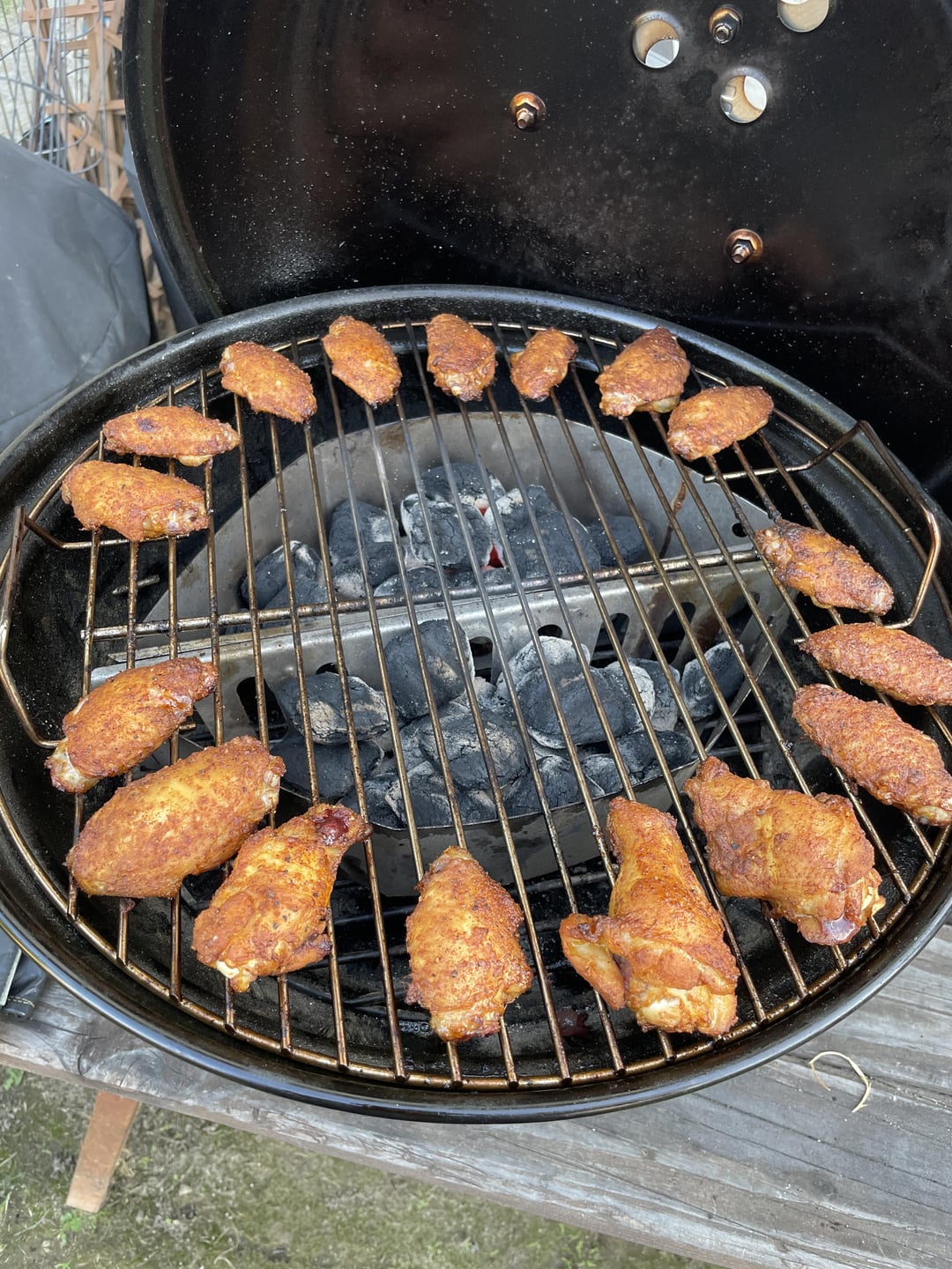 Picked up a Jumbo Joe last week with the pretense of grilling burgers for my stepson’s baseball team bbq. I’d wanted one for a while so it was the perfect excuse. I had a craving for some wings last night while the wife was out and fired it up. Half of a full size chimney was all I needed. I think it’s gonna replace my 22″ Master Touch as my grill of choice!