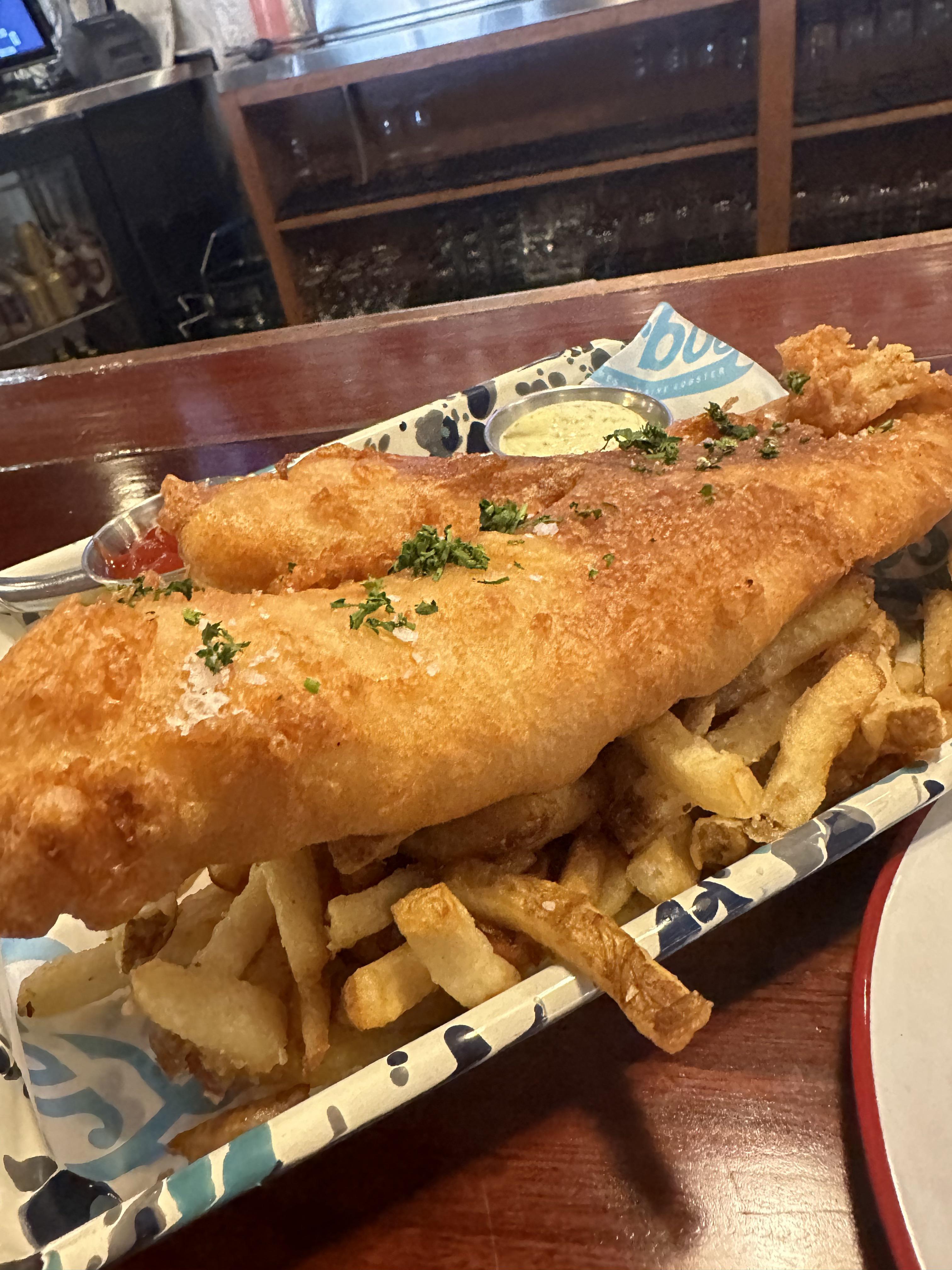 I read good things about the Tuesday fish & chips special at Garbo’s – $14 instead of $24 – but I never expected a fried filet the size of my forearm. Couldn’t even finish all the fries. Probably a big enough plate for two people to split over drinks (and a salad wouldn’t hurt). Watched some US Open tennis at the bar (Gaël Monfils 👏) and reminisced with the bartender about about when the place used to be Opal Divine’s. Good deal, Garbo’s! 👍