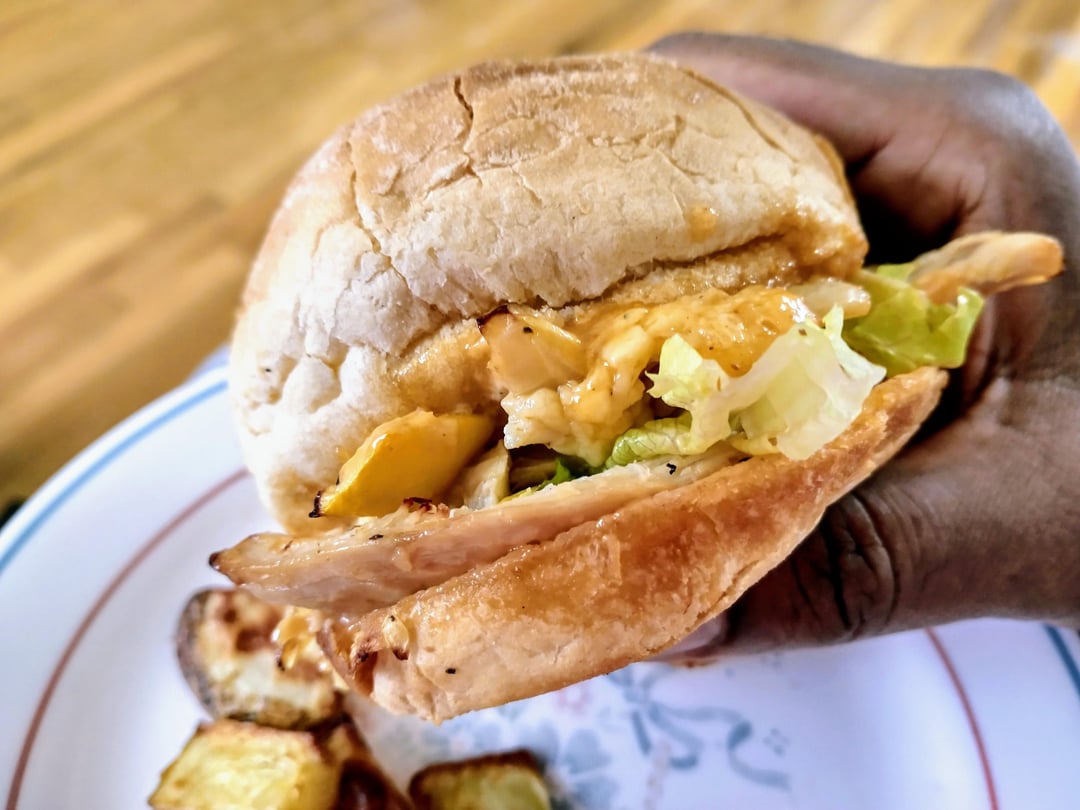 Homemade Chicken Sandwich – Roasted Chicken, Gruyère Cheese, Spicy Mayo, Sautéed Onions, and Shredded Romaine Lettuce on Potato Roll, with Home Fries.by 4food_is_love Write A CommentYou must be logged in to post a comment.