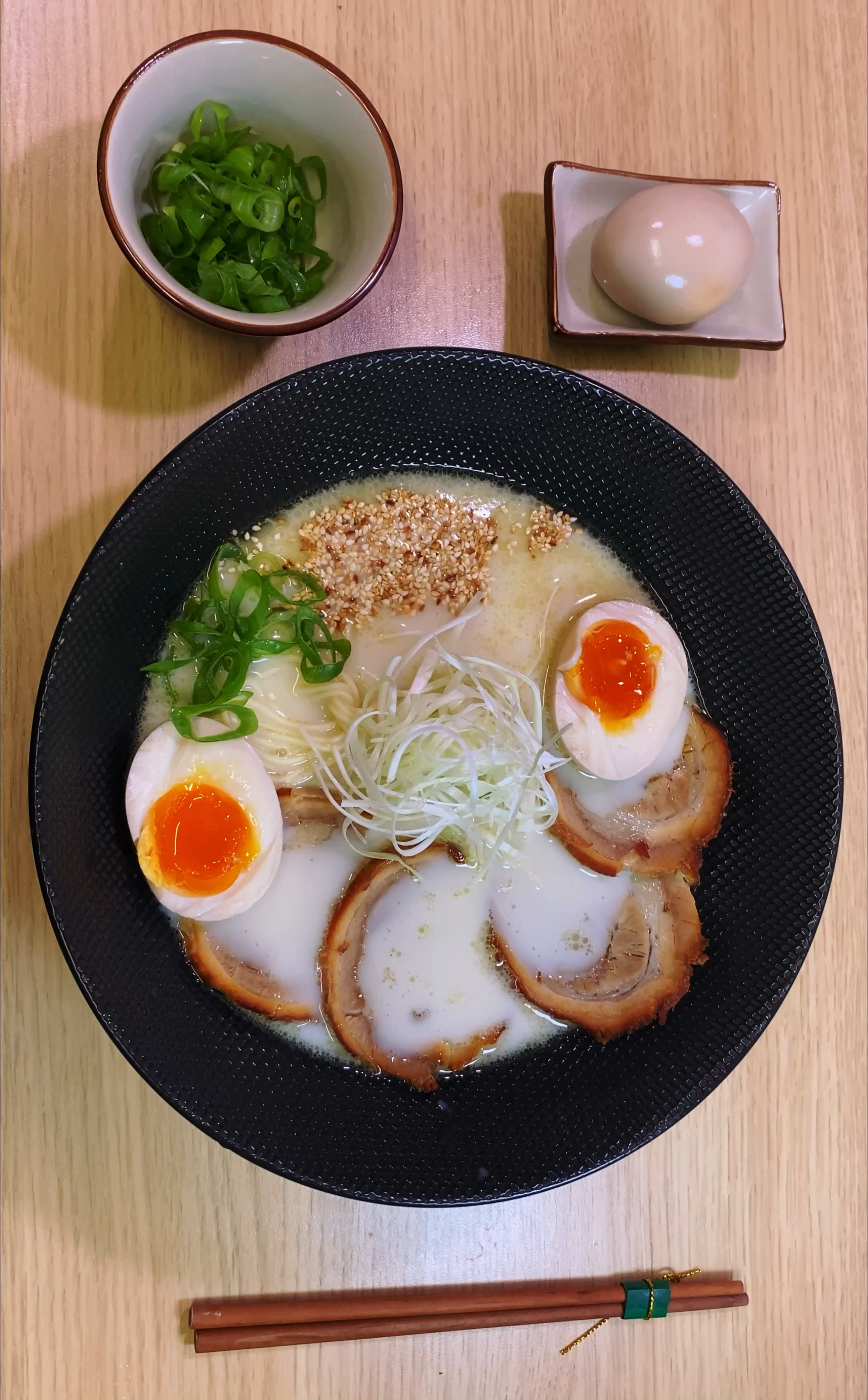The shio Tare was made with kombu, salt, shitake,katsobushi, Mirim, sake and prosciutto. The broth was pork femur, neck, feet, chicken carcass and feet, onion and garlic in the last hour. Chicken skin (chinyu) oil with a LOT of Negi. Sliced chashu, white and green part of scallions, and a very soft seasoned ajitama.