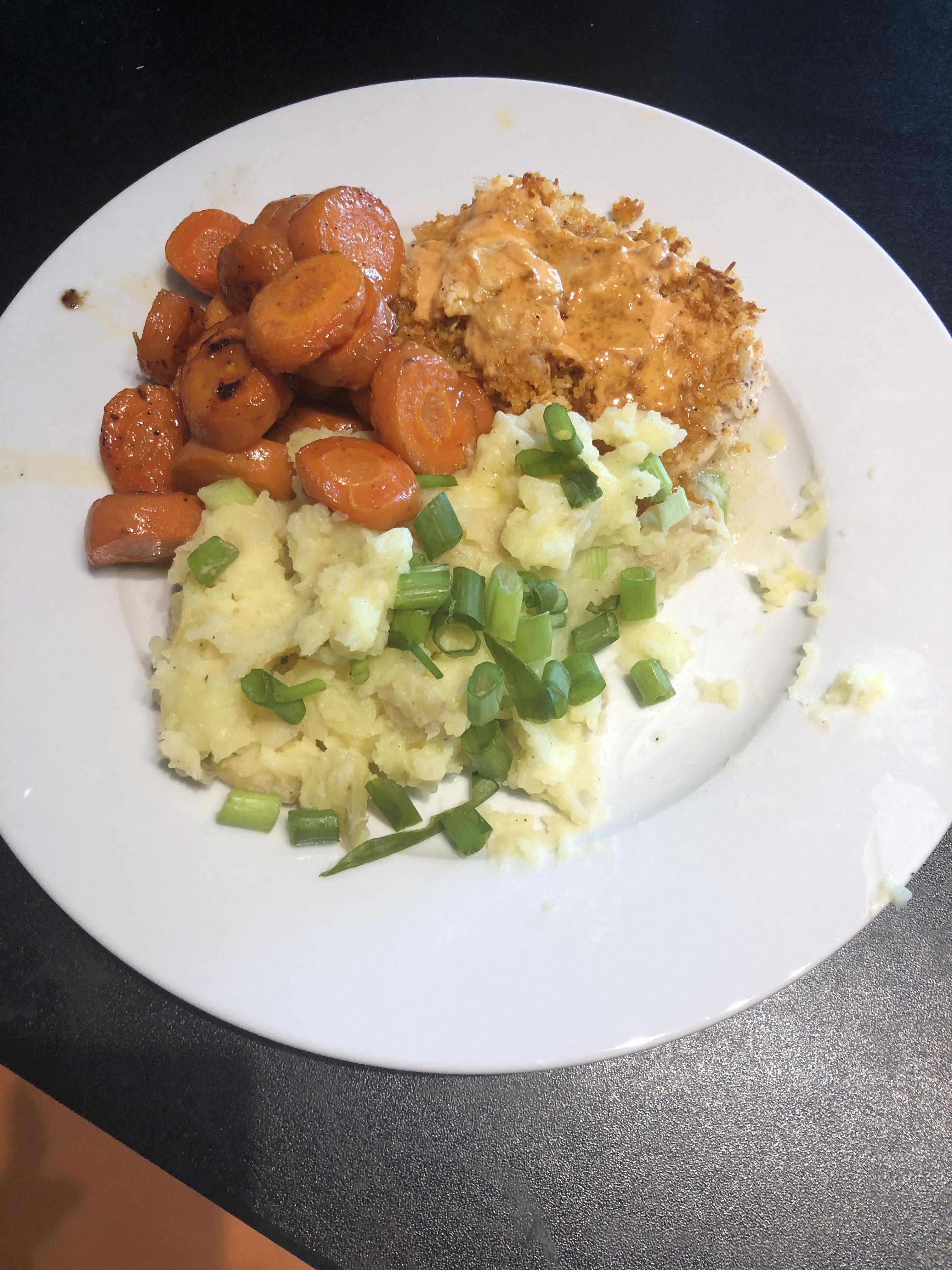 This is one of my favorite dishes, though I never make the mashed potatoes. I usually buy the mac and cheese from the marketplace and serve that instead. Last night, I made corn ribs from Trader Joe’s with it and it was fantastic.