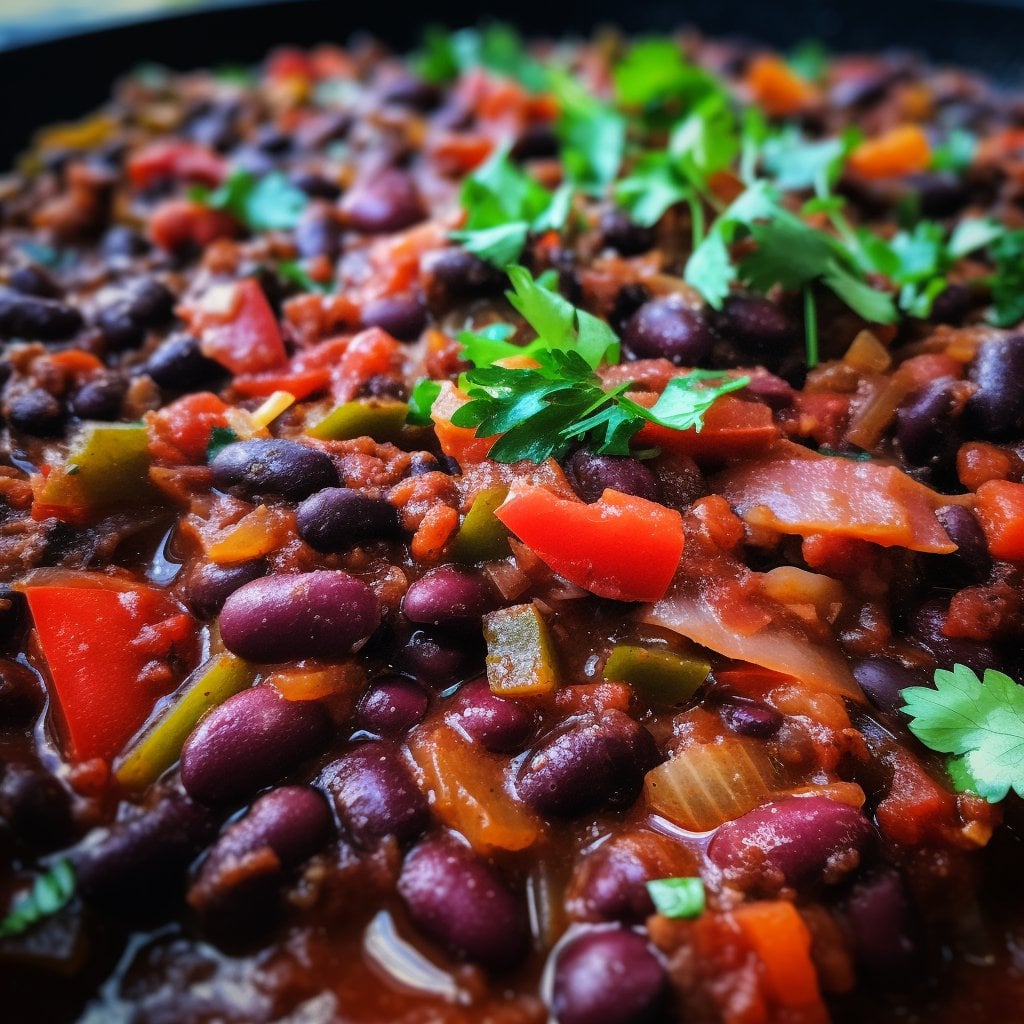 **Step 8:** Serve the vegan chili hot, garnished with fresh cilantro and avocado slices (if desired).