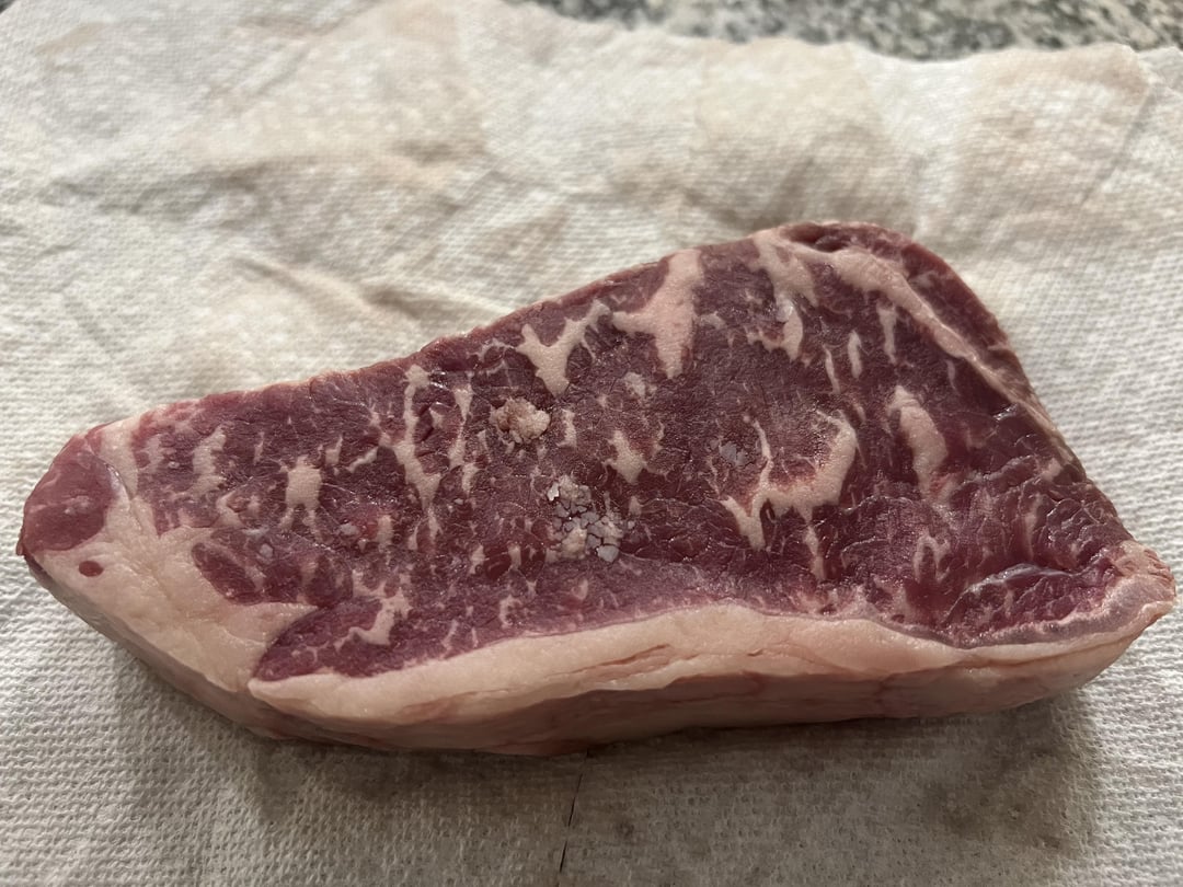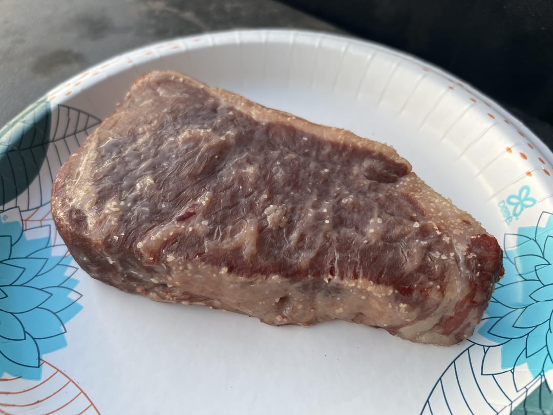 Prime NY Strip. Salted and left on counter for 30 minutes. Smoked at 200 on the camp chef until it hit about 108. Into the fridge for 10 minutes. Seared on cast iron with avacado oil.