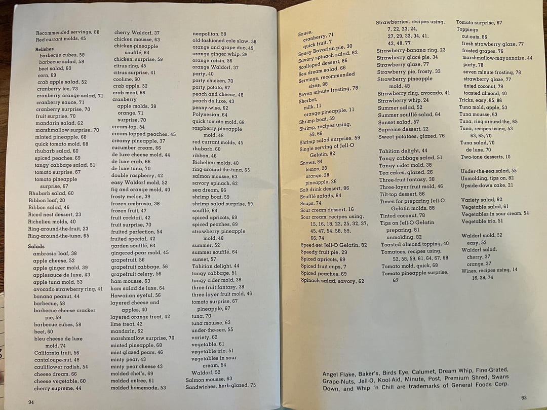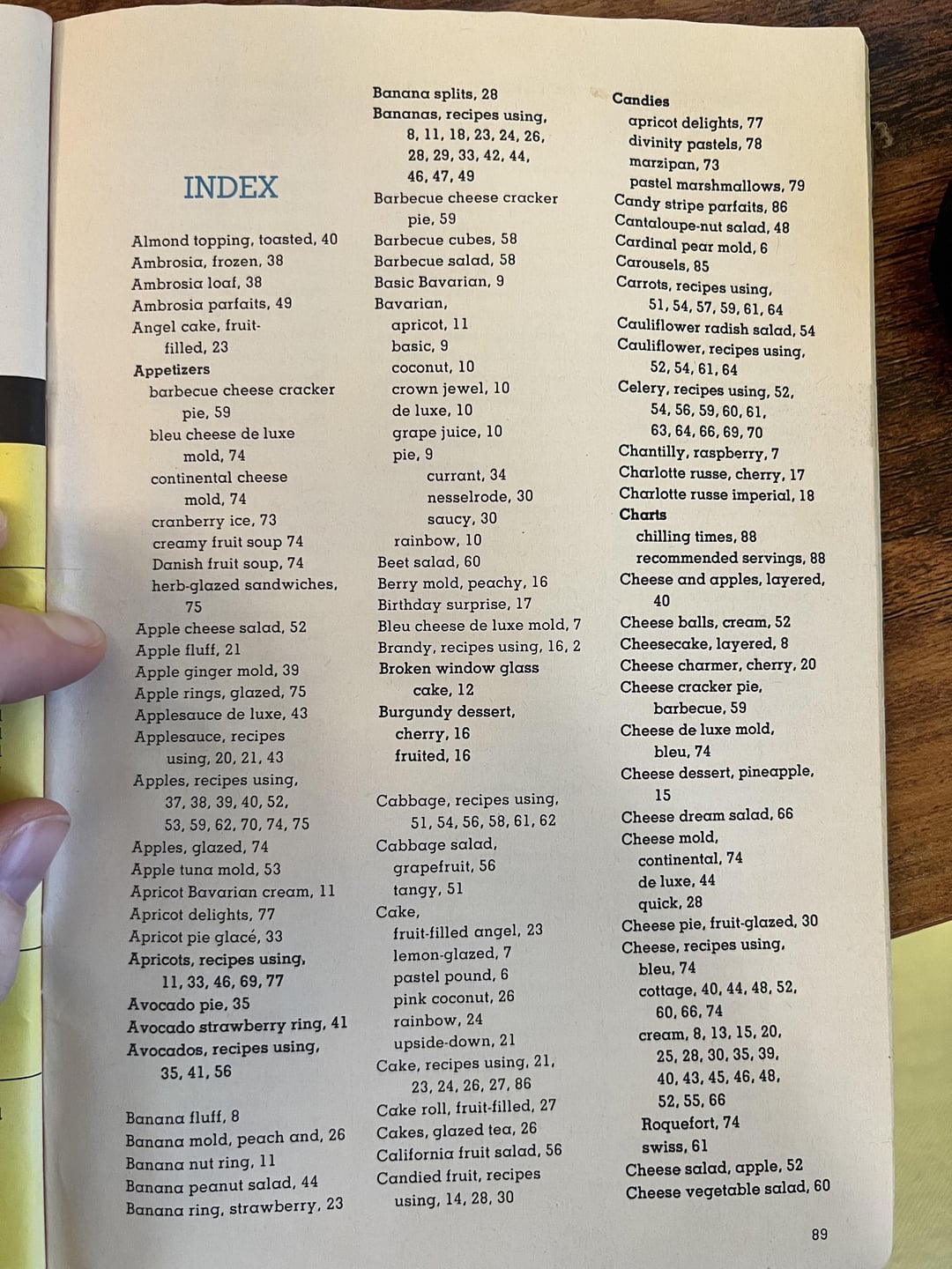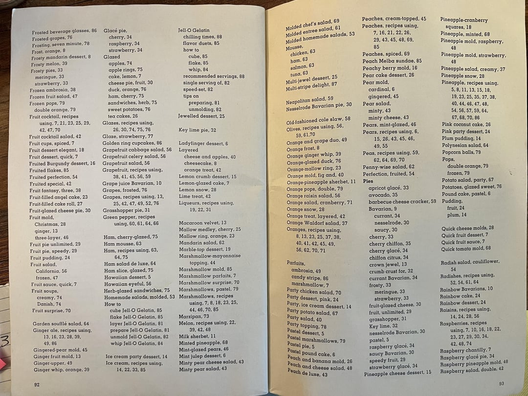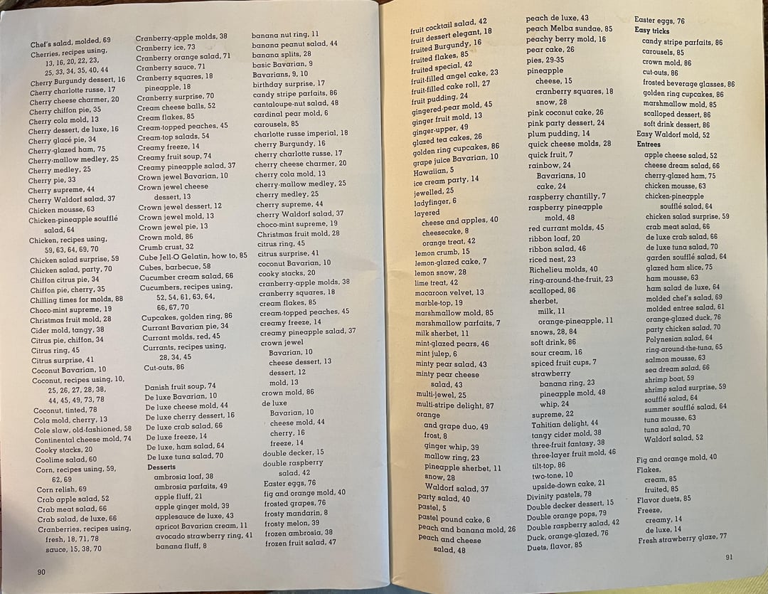 Let me know if anyone has any interest in specific recipes! I’m surprised at the 7 page index! by otterunicorn 7 Comments otterunicorn 2 years ago I just inherited this cookbook, I haven’t tried anything yet, but I’m excited to start! jedv37 2 years ago That’s awesome. Bleu Cheese De Luxe Mold catches my eye. Not that I’d want to eat it though 😜 Southern_Fan_9335 2 years ago I’m in love lol Beautifuleyes917 2 years ago I recently found one of those in my basement. Either belongs to my mom or grandma. bombalicious 2 years ago What a cute book. y4my4my 2 years ago Apple tuna mold, hmmm. Leading_Salt5568 2 years ago Raspberry Chantilly, apple fluff, any parfaits, and the orange layered treat dessert please.Write A CommentYou must be logged in to post a comment.