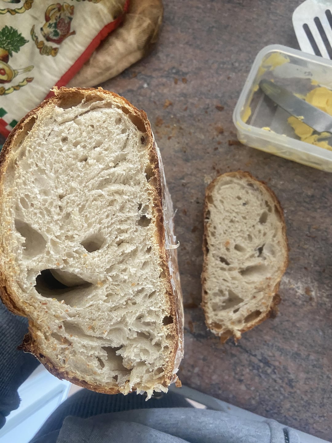 Im a complete new bee and this is my first loaf. I struggled with my starter for awhile but eventually got it. I think the bread is great! A little crispy on the outside but im super stoked about having made it. Would love to hear your opinions so i can better my bread for future loaves. Thank you😊😊