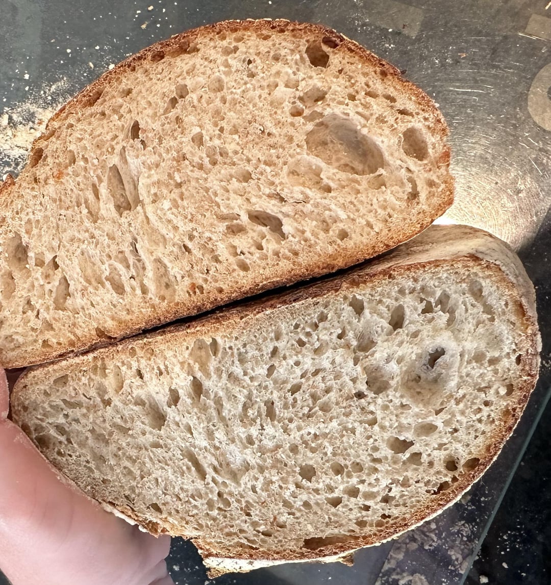 Bulk fermentation on counter around 3 hours, shape, then second rise in the fridge for 15ish hours. Baked in cast iron combo cooker with lid on at 240C for 20mins, then lid off at 220C for another 20 mins