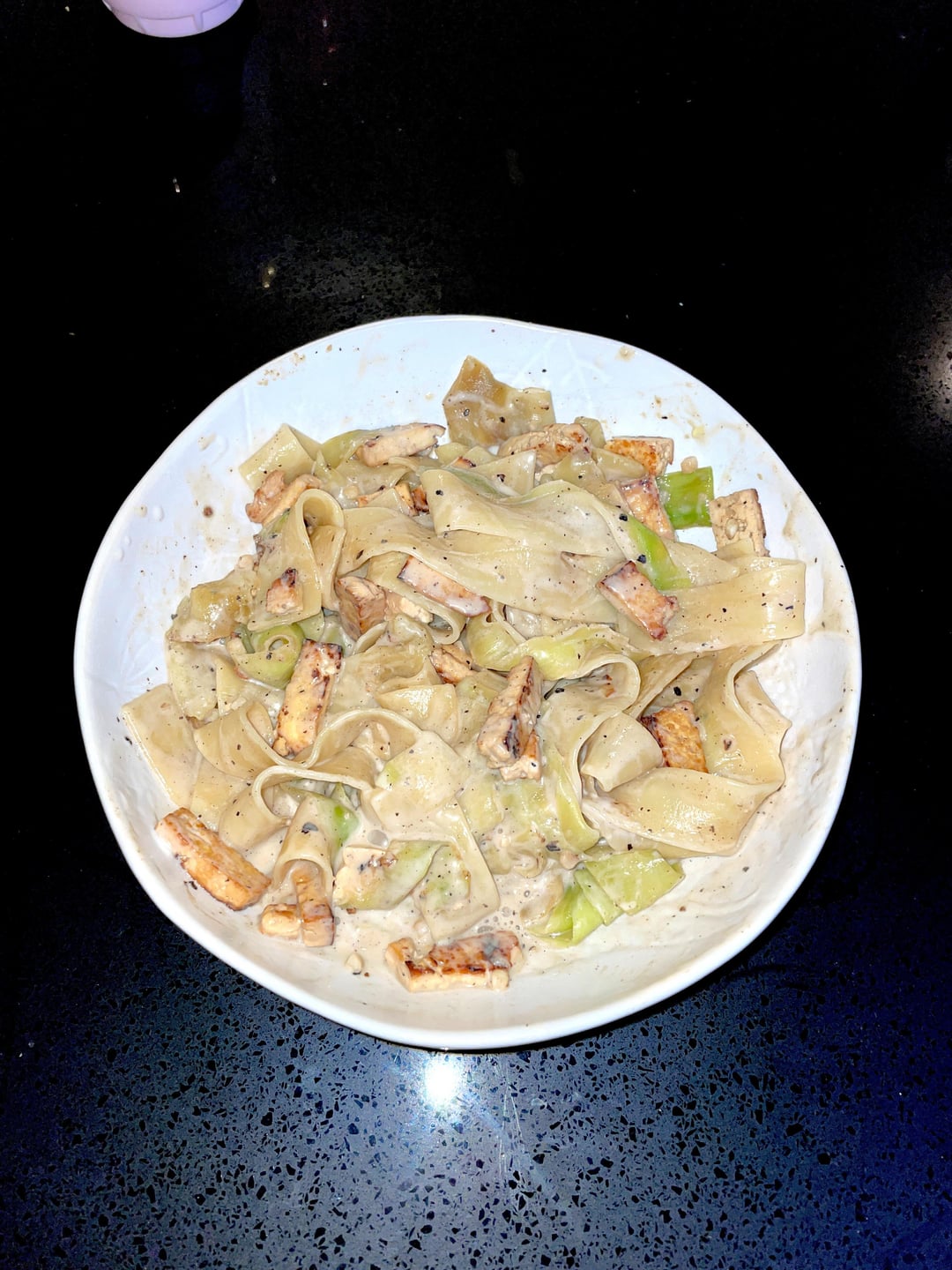 Made with pappardelle, smoked tofu, courgette ribbons, vegan Philadelphia, nooch, salt, pepper and fry light – such a yummy treatby Good-Produce3572 Write A CommentYou must be logged in to post a comment.