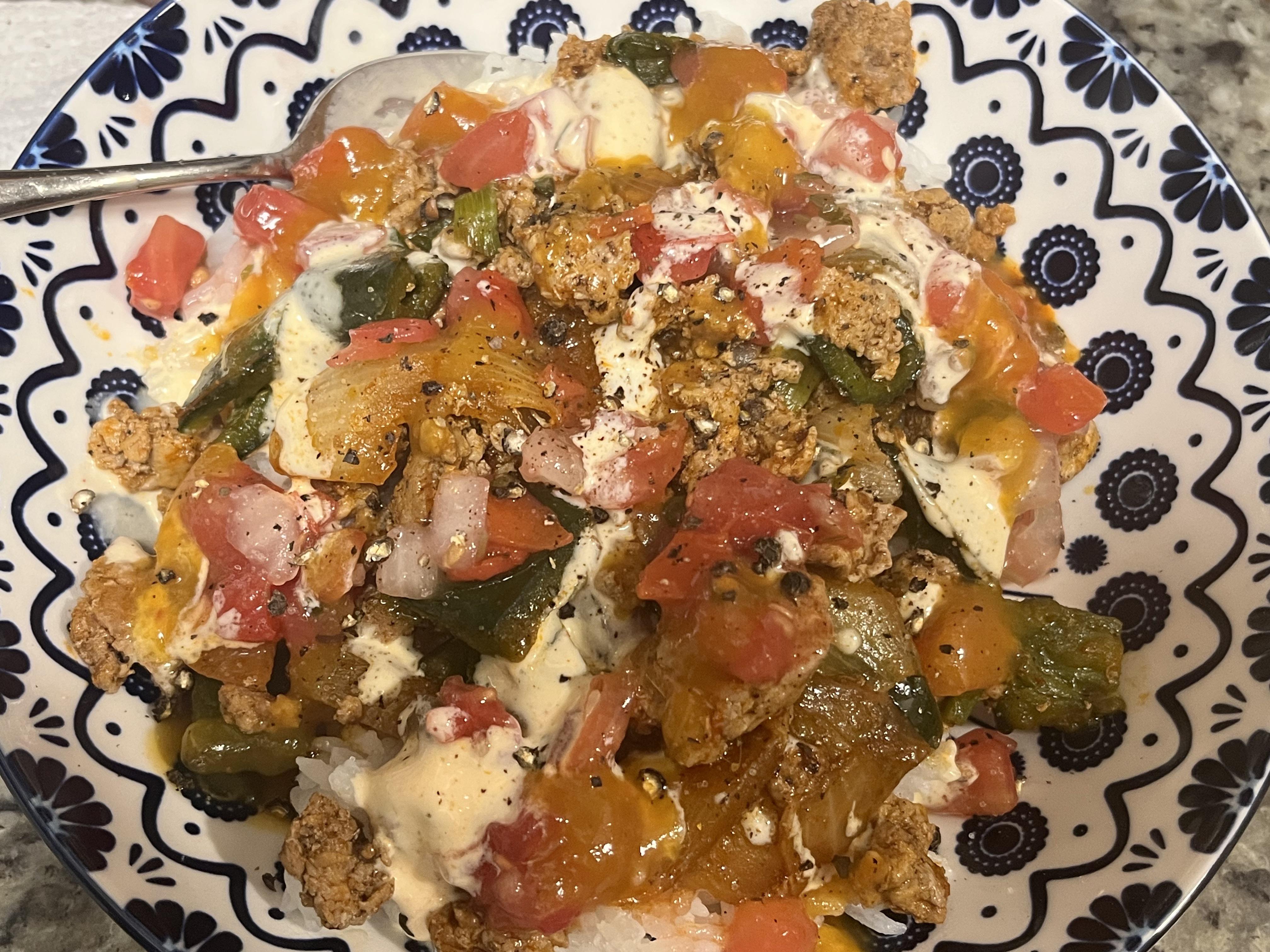 This one was really good and easy with some adjustments. Added dark and smoky crushed peppers to the veggies. Cooked pork and veg together. I like more rice so I doubled to one cup, will do that from now. I’m a Texan and I like it hot. Added habanero salsa topper. The pico is bland, can get better from H-E-B. But overall a fine lunch with some tweaks. Reminder: I am a home cook like y’all not a food photographer. I rec this one.