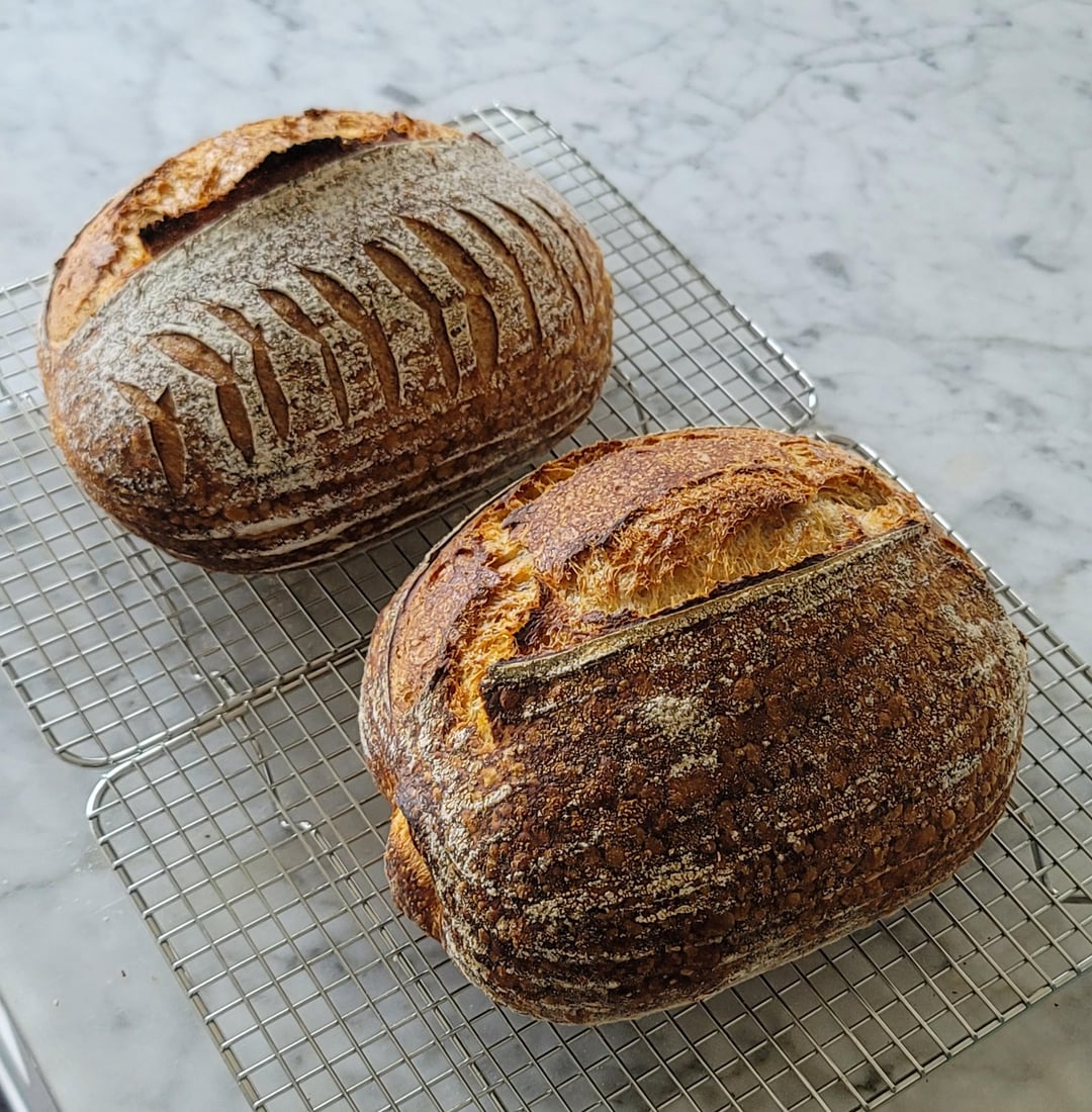 Still need to work on my scoring art skills, but I think these loaves turned out beautifully! Perfect sourness, bread texture, and crust crunch. I used this recipe from Basics with Babish (though it’s Joshua Weissman’s recipe): https://basicswithbabish.co/basicsepisodes/sourdough-bread
