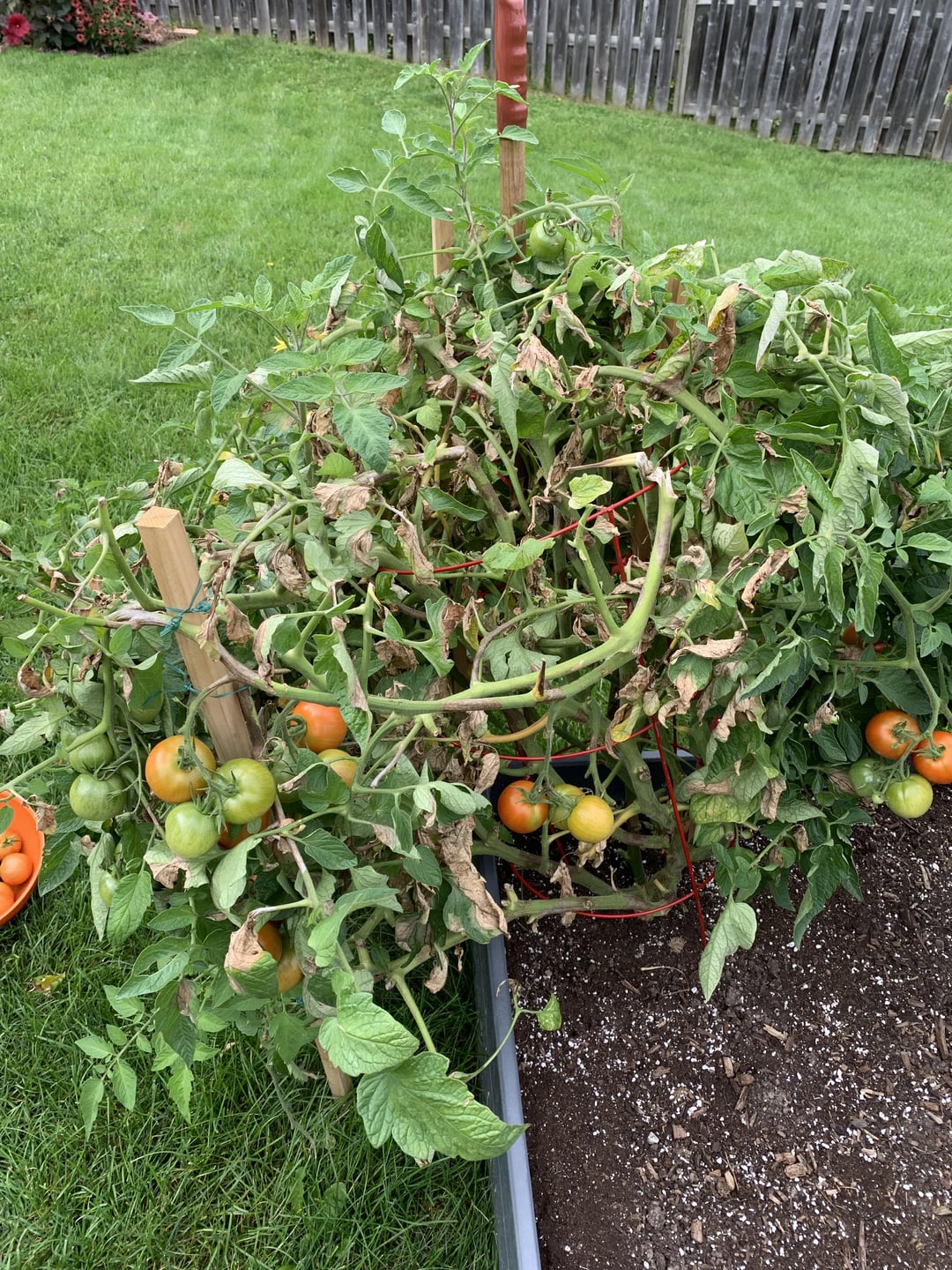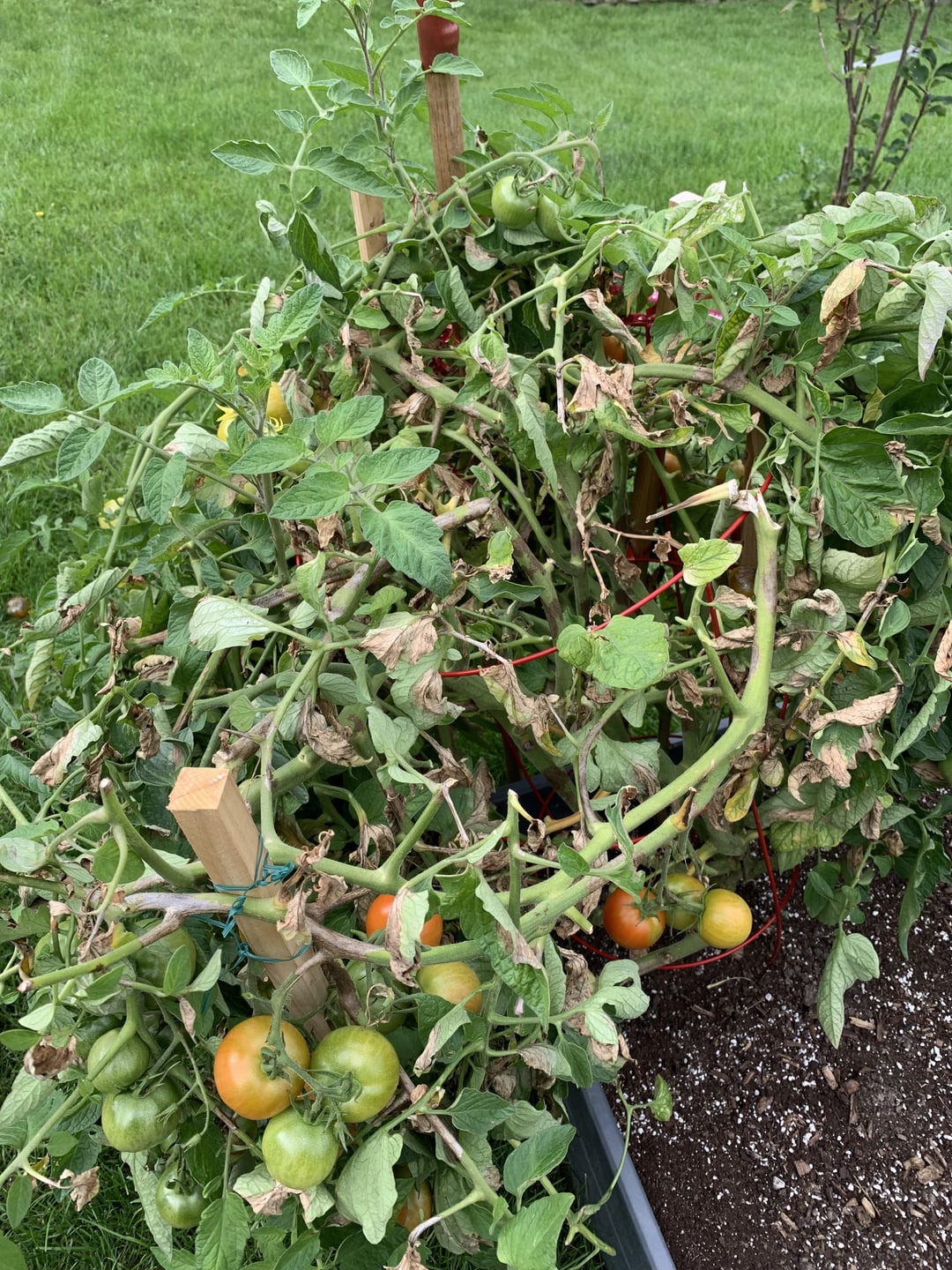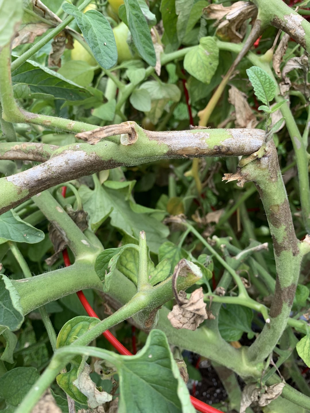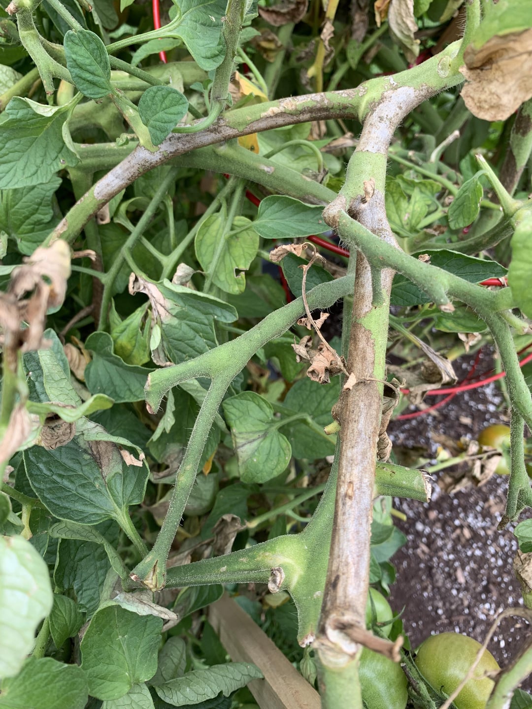 A few days after fertilizing my slicer and giving some branches some support some of the stems have gotten blotchy black spots and a lot of branches and leaves are dying. Some of the tomatoes are also looking like they’re rotting from the top. The left side/middle of the plant is the worst with the right sides stems still looking healthy and green. It’s still bearing healthy fruit but also some gnarly looking ones which is confusing. I’ve already gotten 203 tomatoes off this plant so I’m not really worried about harvest at this point but I’m curious as to what caused this ?