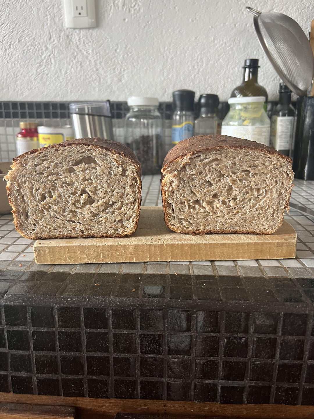 Do an autolyse with seeds, honey, salt, and wheat using warm water. Add rest of ingredients after 30 minutes. Stretch and folds like 4-6 times or until ready every 25-30min. Bulk ferment for 5 hours at room temp with 6 hour retard in fridge because i went to the feria. Take out fridge shape and let sit for 30 min at room temp before putting in fridge overnight. Bake at whatever #5 is on a Mabe oven for 45min (15 w/ steam and 30 w/o). Brush with ghee after.